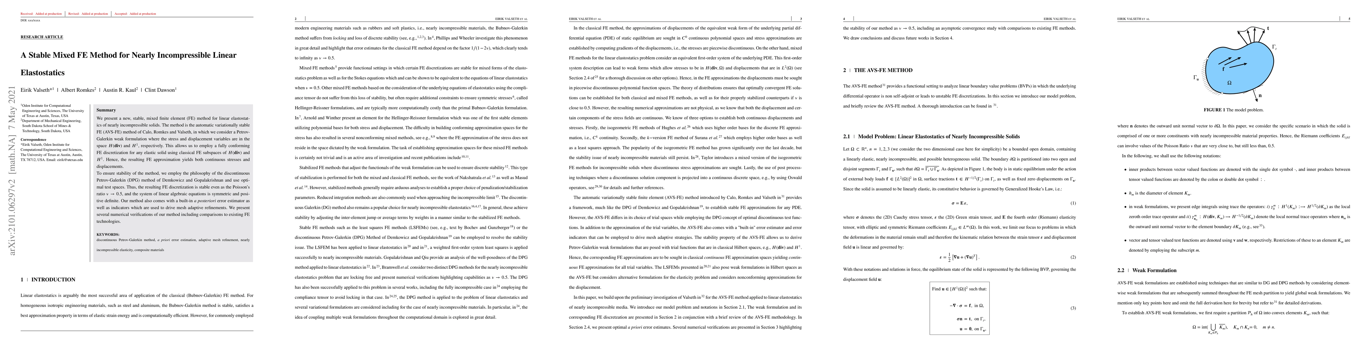 We present a new, stable, mixed finite element (FE) method for linear elastostatics of nearly incompressible solids. The method is the automatic variationally stable FE (AVS-FE) method of Calo, Romkes and Valseth, in which we consider a Petrov-Galerkin weak formulation where the stress and displacement variables are in the space H(div)xH1, respectively. This allows us to employ a fully conforming FE discretization for any elastic solid using classical FE subspaces of H(div) and H1. Hence, the resulting FE approximation yields both continuous stresses and displacements. To ensure stability of the method, we employ the philosophy of the discontinuous Petrov-Galerkin (DPG) method of Demkowicz and Gopalakrishnan and use optimal test spaces. Thus, the resulting FE discretization is stable even as the Poisson ratio approaches 0.5, and the system of linear algebraic equations is symmetric and positive definite. Our method also comes with a built-in a posteriori error estimator as well as well as indicators which are used to drive mesh adaptive refinements. We present several numerical verifications of our method including comparisons to existing FE technologies.