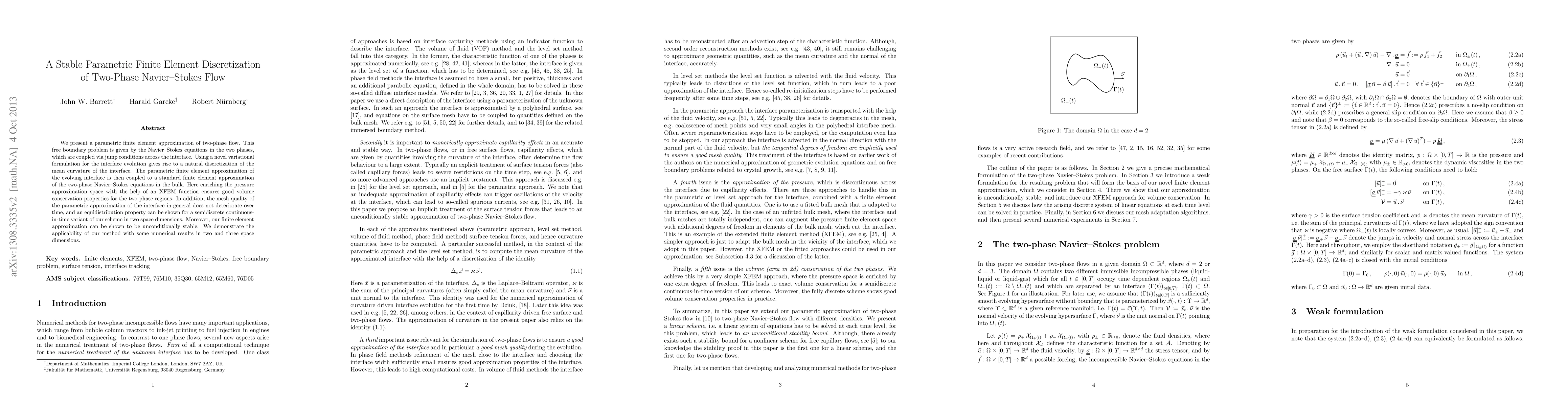 This paper presents a stable parametric finite element method for simulating two-phase Navier-Stokes flow, ensuring good volume conservation and interface stability. The method combines a novel variational formulation for interface evolution with an XFEM-enhanced pressure approximation, demonstrating unconditional stability and applicability through numerical results.
