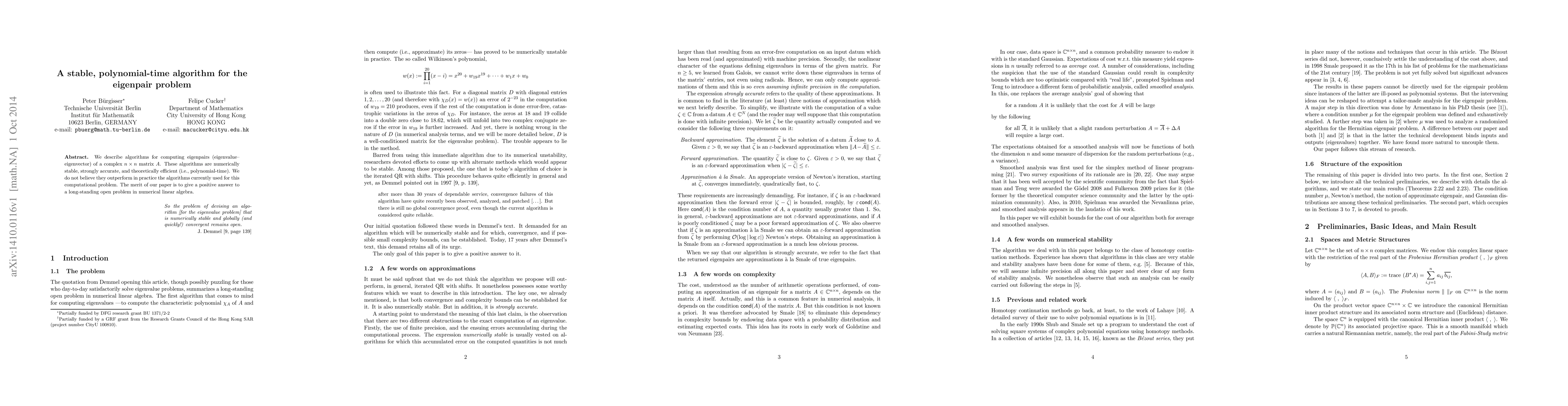 We describe algorithms for computing eigenpairs (eigenvalue--eigenvector) of a complex $n\times n$ matrix $A$. These algorithms are numerically stable, strongly accurate, and theoretically efficient (i.e., polynomial-time). We do not believe they outperform in practice the algorithms currently used for this computational problem. The merit of our paper is to give a positive answer to a long-standing open problem in numerical linear algebra.