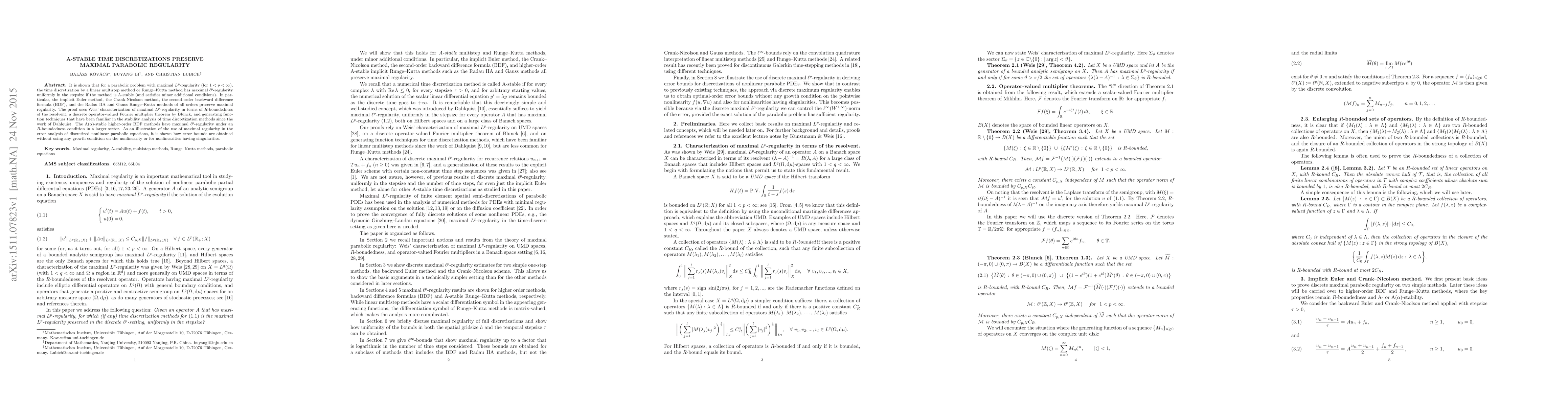 This paper demonstrates that A-stable time discretization methods, such as the implicit Euler, Crank-Nicolson, and higher-order BDF methods, maintain maximal regularity for parabolic problems. The analysis leverages $R$-boundedness and stability properties to derive uniform $\ell^p$-regularity across step sizes.