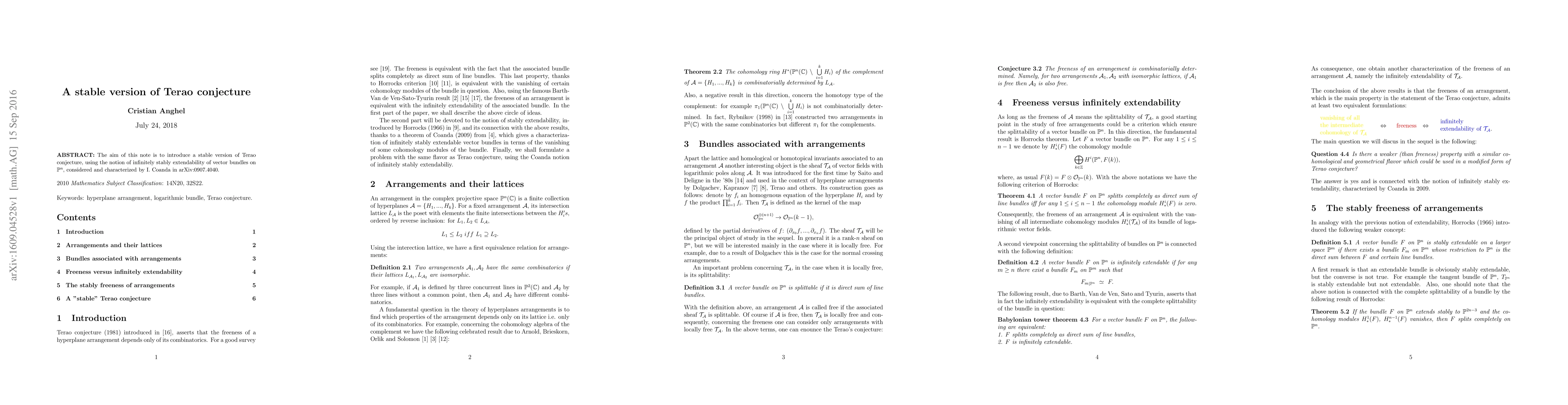 The aim of this note is to introduce a stable version of Terao conjecture, using the notion of infinitely stably extendability of vector bundles on $\mathbb P^n$, considered and characterized by I. Coanda in arXiv:0907.4040.