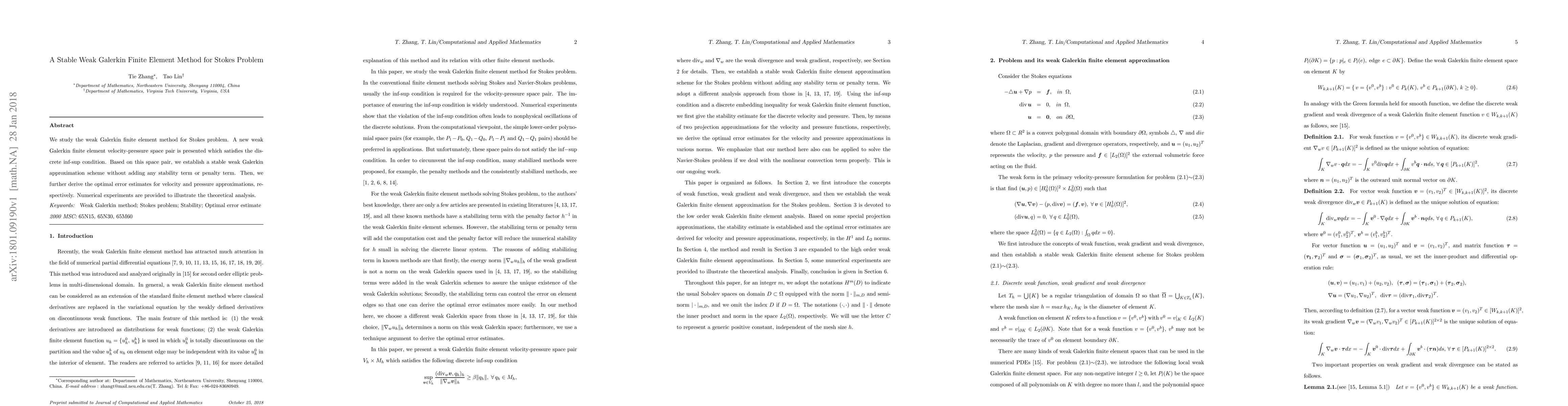 This paper introduces a stable weak Galerkin finite element method for solving the Stokes problem, presenting a new velocity-pressure space pair that satisfies the discrete inf-sup condition, and establishing a stable approximation scheme without additional stability terms. Optimal error estimates and numerical experiments validate the theoretical findings.