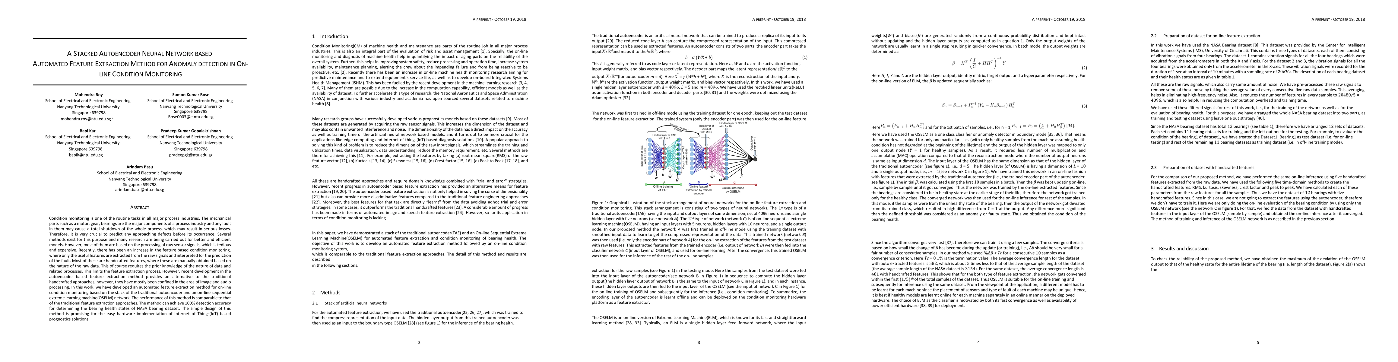 This paper proposes a stacked autoencoder neural network combined with an online sequential extreme learning machine (OSELM) for automated feature extraction in anomaly detection for on-line condition monitoring. The method achieves 100% detection accuracy for bearing health states, offering a promising alternative to traditional handcrafted feature extraction methods.