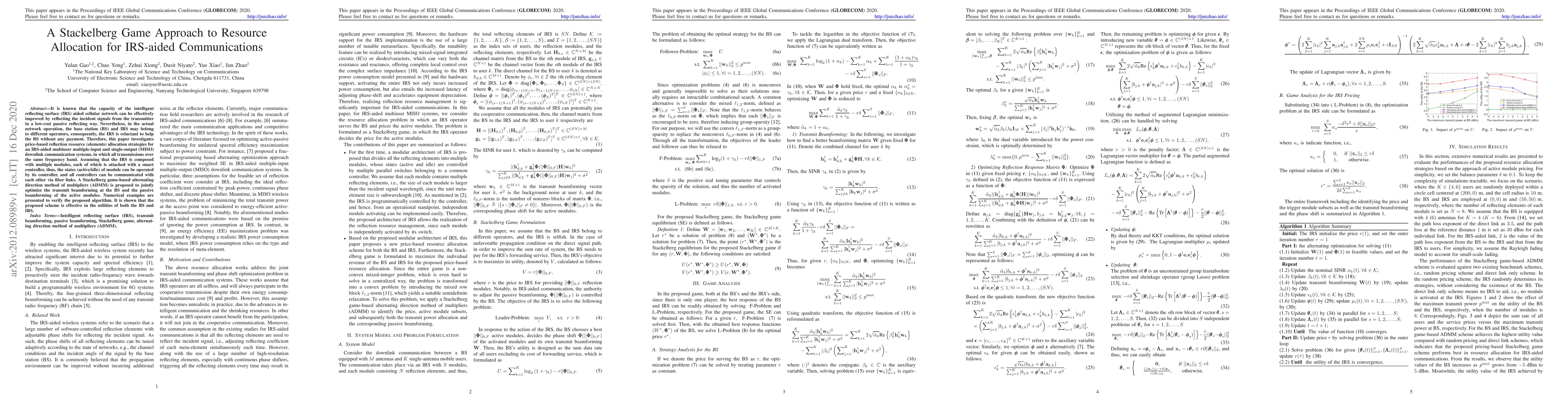 This paper proposes a Stackelberg game-based ADMM for optimizing resource allocation in IRS-aided MISO communication systems, addressing the challenge of incentivizing IRS modules to assist base stations without direct payment. The approach effectively balances the utilities of both the base station and the IRS.
