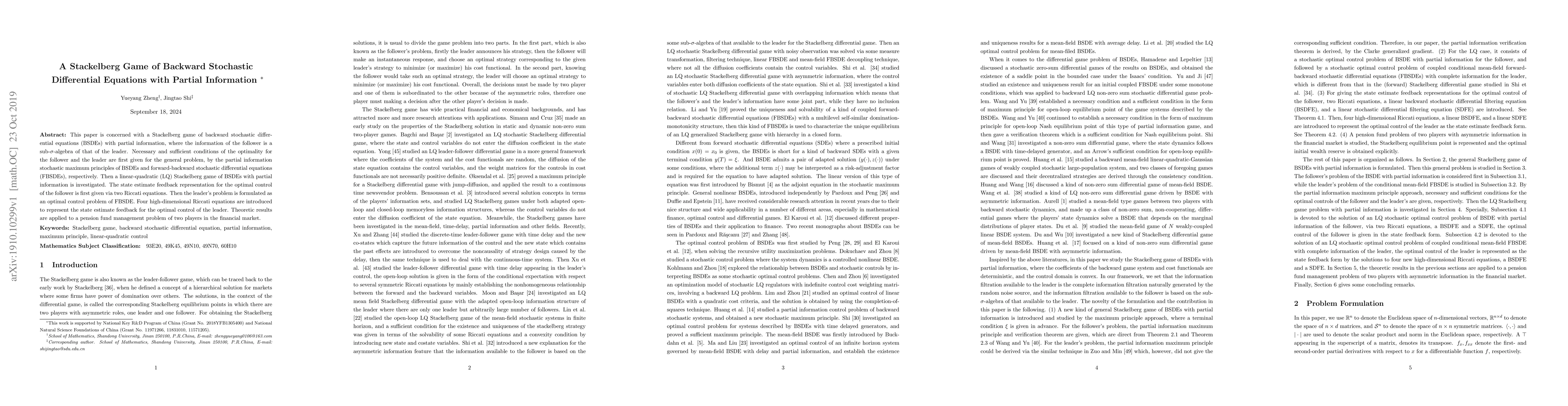 This paper explores a Stackelberg game involving backward stochastic differential equations (BSDEs) under partial information, deriving necessary and sufficient optimality conditions for the leader and follower using stochastic maximum principles. The study further investigates the linear-quadratic (LQ) Stackelberg game, providing state estimate feedback representations for optimal controls via Riccati equations and applying the theory to a pension fund management problem.