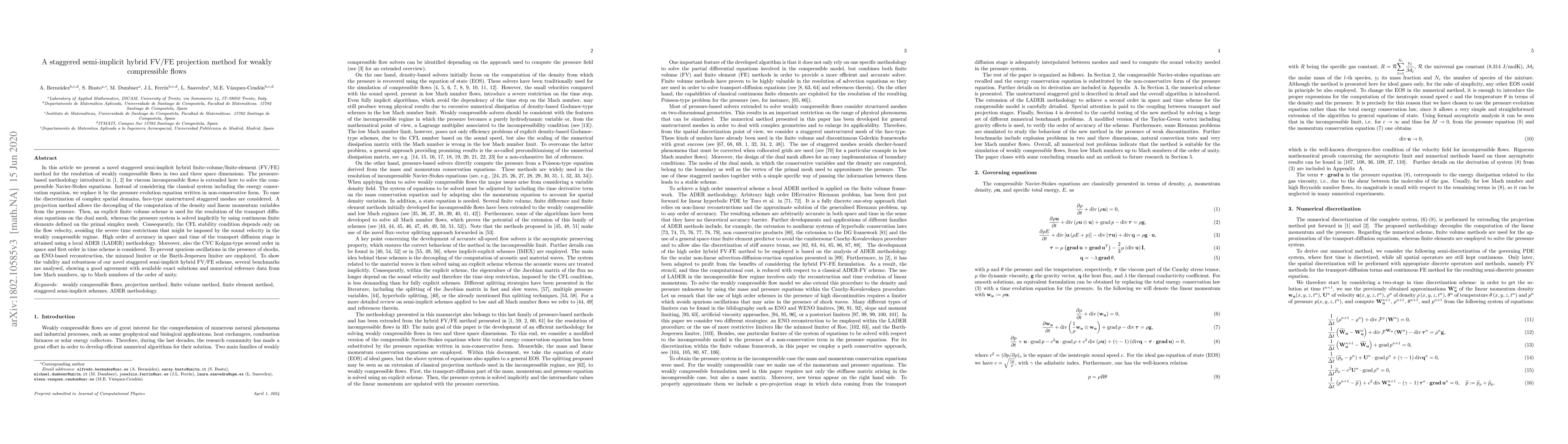 This paper presents a novel staggered semi-implicit hybrid finite-volume/finite-element method for solving weakly compressible flows, extending previous incompressible methodologies. The method uses a projection scheme to decouple density and pressure, allowing for high-order accuracy and robustness against shocks.