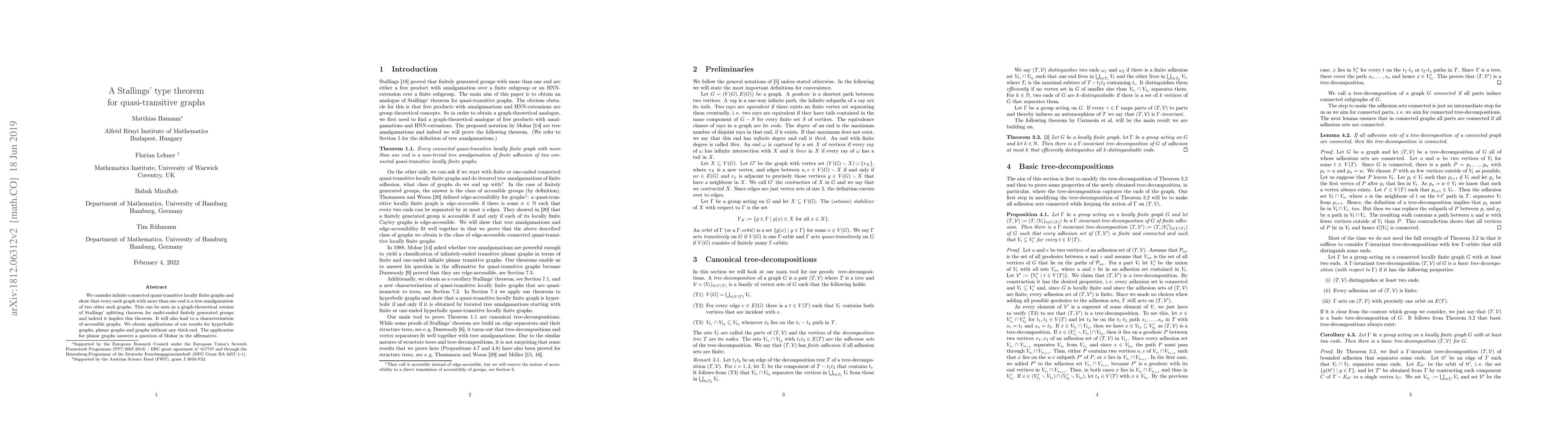 This paper proves a Stallings' type theorem for infinite connected quasi-transitive locally finite graphs, showing they decompose as tree amalgamations of two other such graphs if they have more than one end. This result extends Stallings' splitting theorem for multi-ended finitely generated groups and provides applications to hyperbolic, planar, and acyclic graphs.