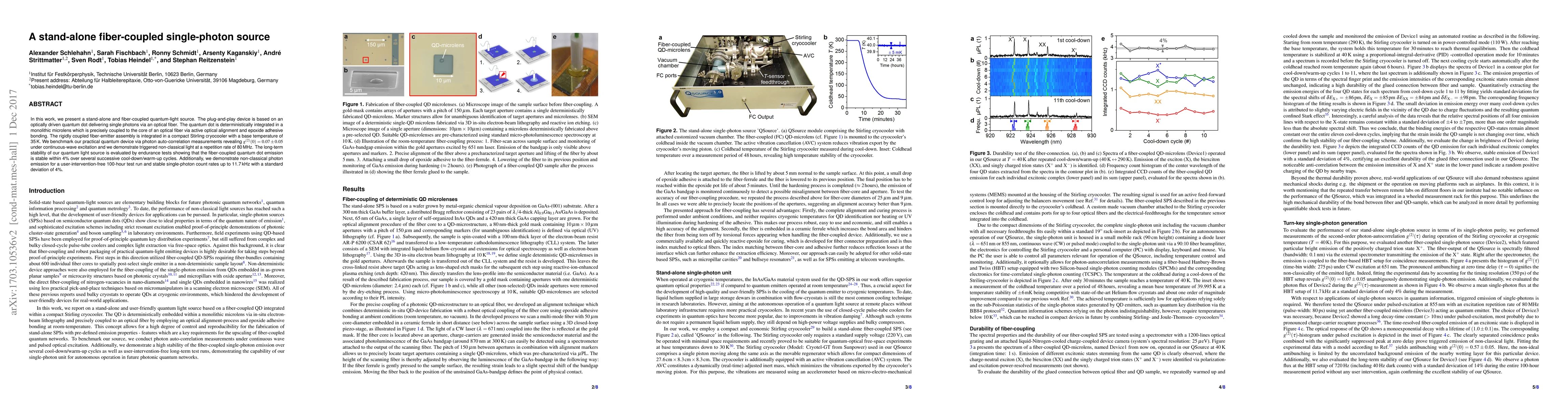 The paper introduces a stand-alone, fiber-coupled single-photon source with deterministic quantum dot integration, room-temperature alignment, and high stability, utilizing a compact Stirling cryocooler.