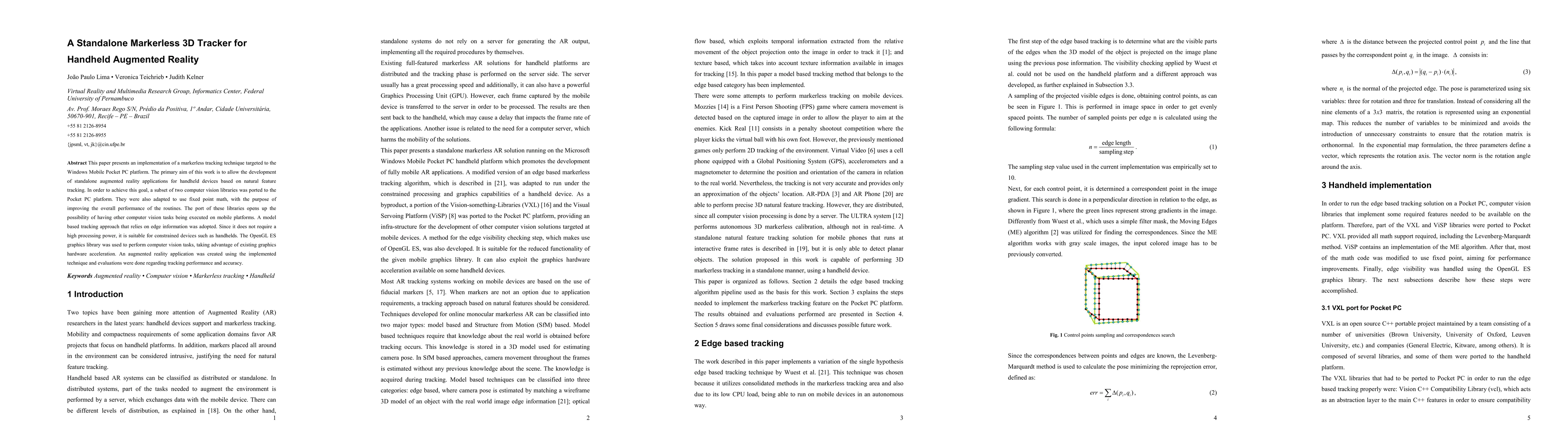 This paper introduces a markerless 3D tracking technique for Windows Mobile Pocket PC, enabling standalone augmented reality applications via natural feature tracking. The technique leverages edge information and fixed point math for performance, utilizing OpenGL ES for graphics acceleration and demonstrating tracking performance and accuracy.