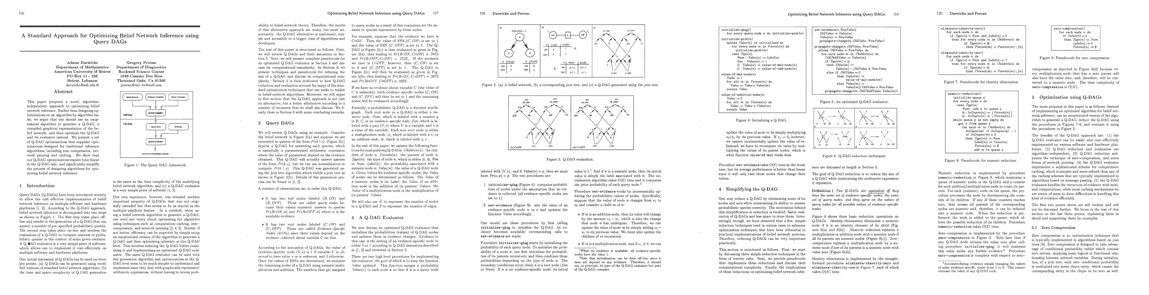 This paper introduces a method for optimizing belief network inference using Query DAGs (Q-DAGs) instead of algorithm-specific optimizations. It presents a set of Q-DAG optimizations, including zero compression, network pruning, and caching, which simplify the inference process and require linear time relative to the Q-DAG size.