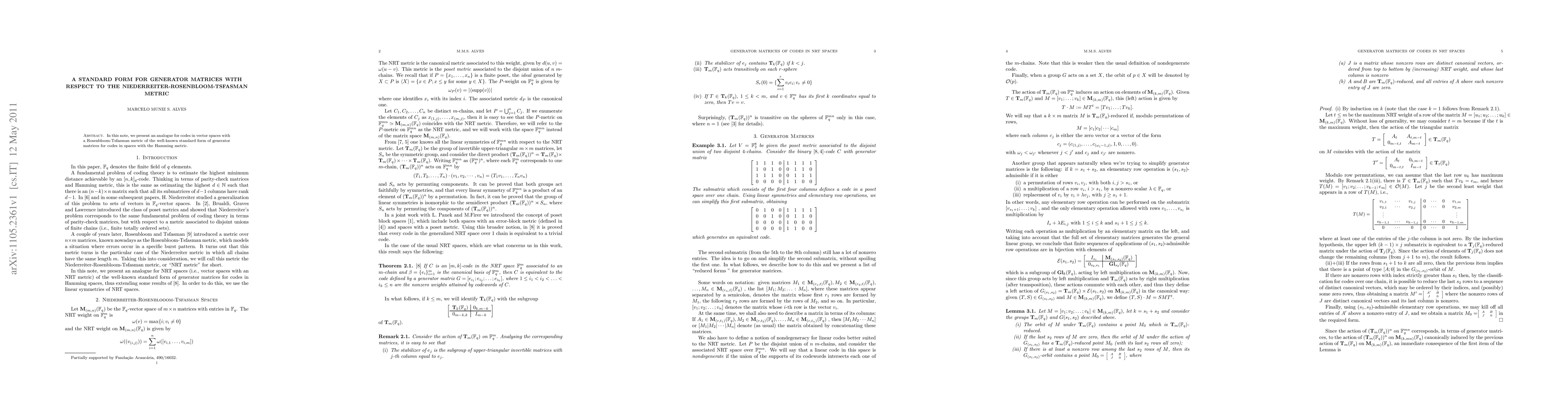 In this note, we present an analogue for codes in vector spaces with a Rosenbloom-Tsfasman metric of the well-known standard form of generator matrices for codes in spaces with the Hamming metric.