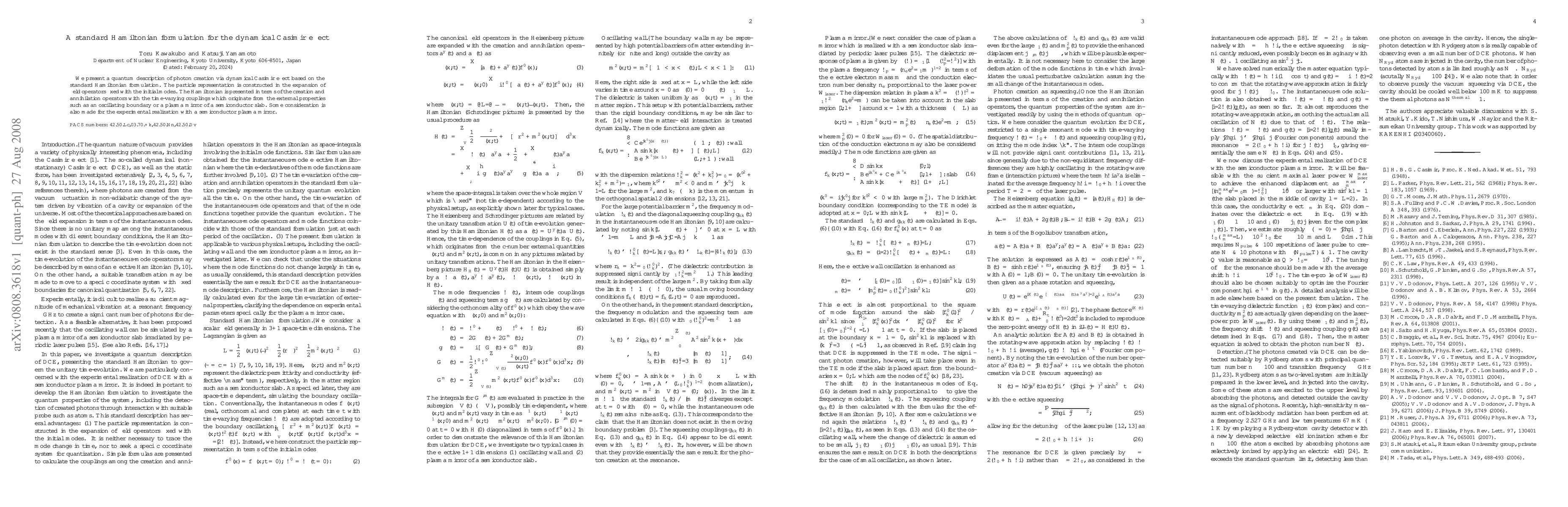 This paper develops a standard Hamiltonian formulation for the dynamical Casimir effect, describing photon creation through time-varying couplings in quantum field theory, and considers experimental realization using semiconductor plasma mirrors.