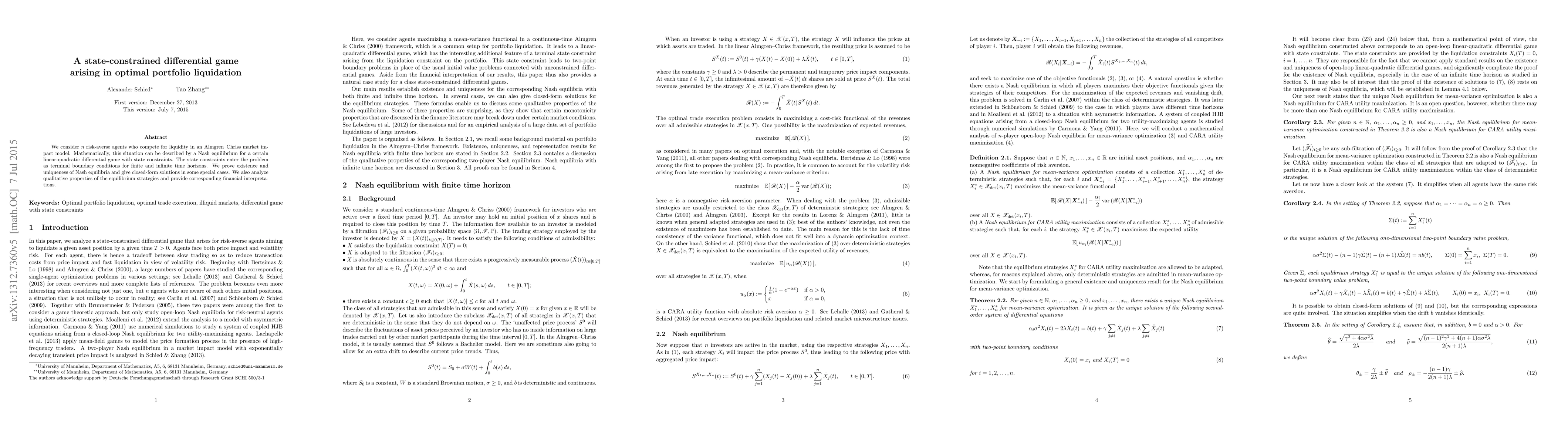 We consider $n$ risk-averse agents who compete for liquidity in an Almgren--Chriss market impact model. Mathematically, this situation can be described by a Nash equilibrium for a certain linear-quadratic differential game with state constraints. The state constraints enter the problem as terminal boundary conditions for finite and infinite time horizons. We prove existence and uniqueness of Nash equilibria and give closed-form solutions in some special cases. We also analyze qualitative properties of the equilibrium strategies and provide corresponding financial interpretations.