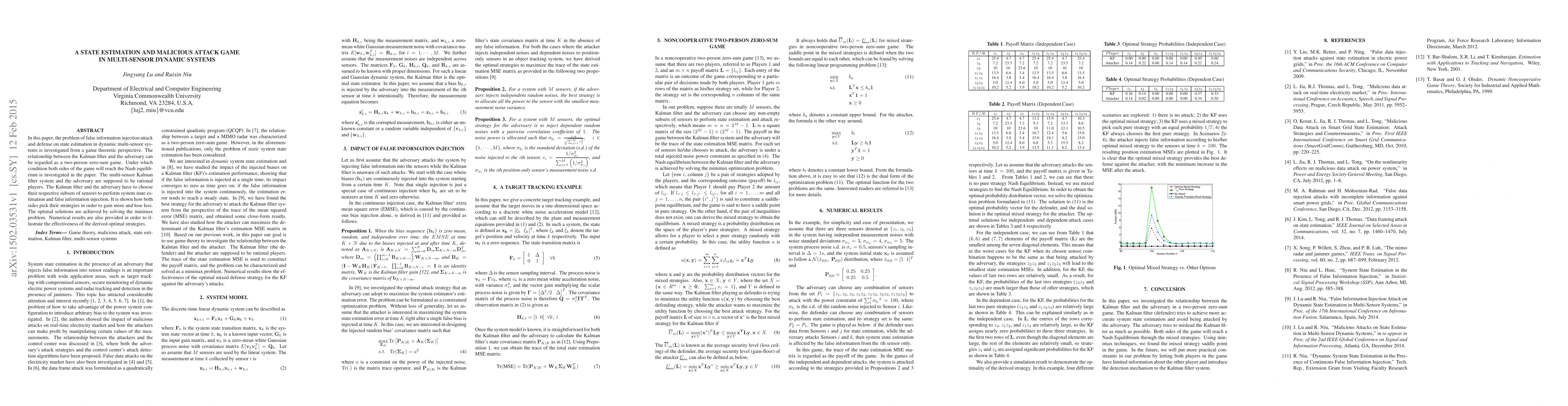 In this paper, the problem of false information injection attack and defense on state estimation in dynamic multi-sensor systems is investigated from a game theoretic perspective. The relationship between the Kalman filter and the adversary can be regarded as a two-person zero-sum game. Under which condition both sides of the game will reach the Nash equilibrium is investigated in the paper. The multi-sensor Kalman filter system and the adversary are supposed to be rational players. The Kalman filter and the adversary have to choose their respective subsets of sensors to perform system state estimation and false information injection. It is shown how both sides pick their strategies in order to gain more and lose less. The optimal solutions are achieved by solving the minimax problem. Numerical results are also provided in order to illustrate the effectiveness of the derived optimal strategies.