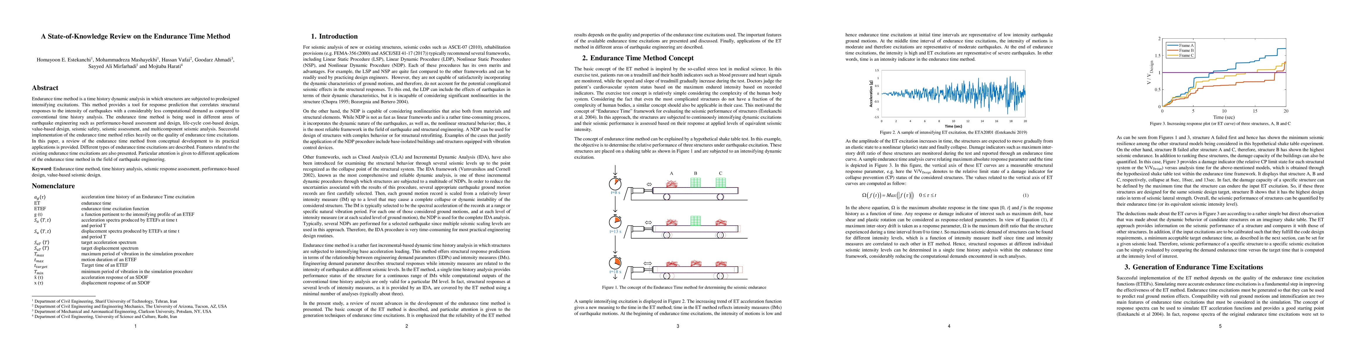 This paper reviews the endurance time method, a dynamic analysis tool for predicting structural responses to earthquakes with lower computational demand than conventional methods. It explores various applications in earthquake engineering and highlights the importance of high-quality endurance time excitations.