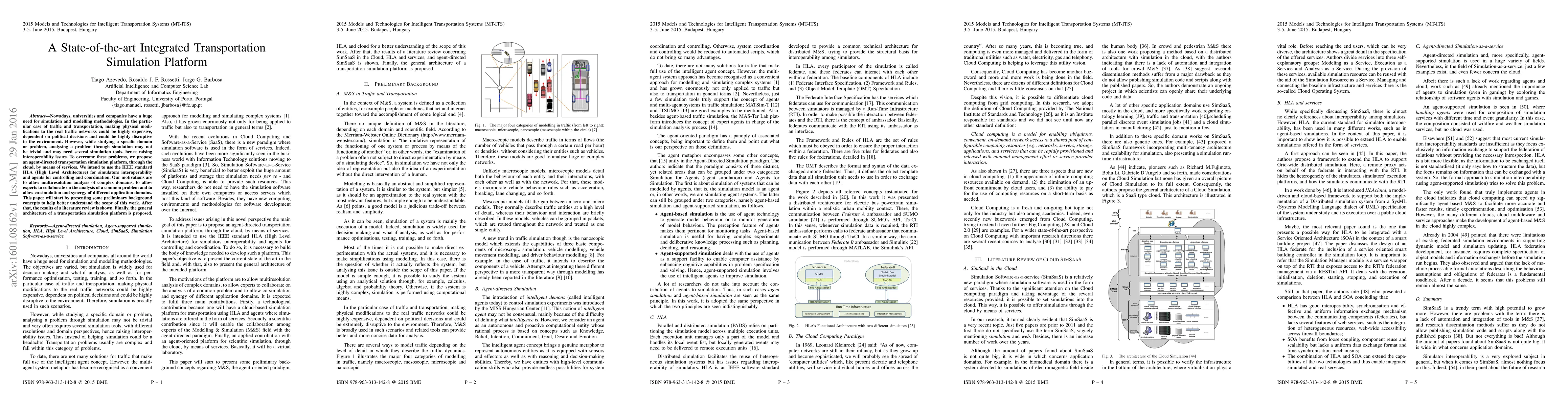 Nowadays, universities and companies have a huge need for simulation and modelling methodologies. In the particular case of traffic and transportation, making physical modifications to the real traffic networks could be highly expensive, dependent on political decisions and could be highly disruptive to the environment. However, while studying a specific domain or problem, analysing a problem through simulation may not be trivial and may need several simulation tools, hence raising interoperability issues. To overcome these problems, we propose an agent-directed transportation simulation platform, through the cloud, by means of services. We intend to use the IEEE standard HLA (High Level Architecture) for simulators interoperability and agents for controlling and coordination. Our motivations are to allow multiresolution analysis of complex domains, to allow experts to collaborate on the analysis of a common problem and to allow co-simulation and synergy of different application domains. This paper will start by presenting some preliminary background concepts to help better understand the scope of this work. After that, the results of a literature review is shown. Finally, the general architecture of a transportation simulation platform is proposed.