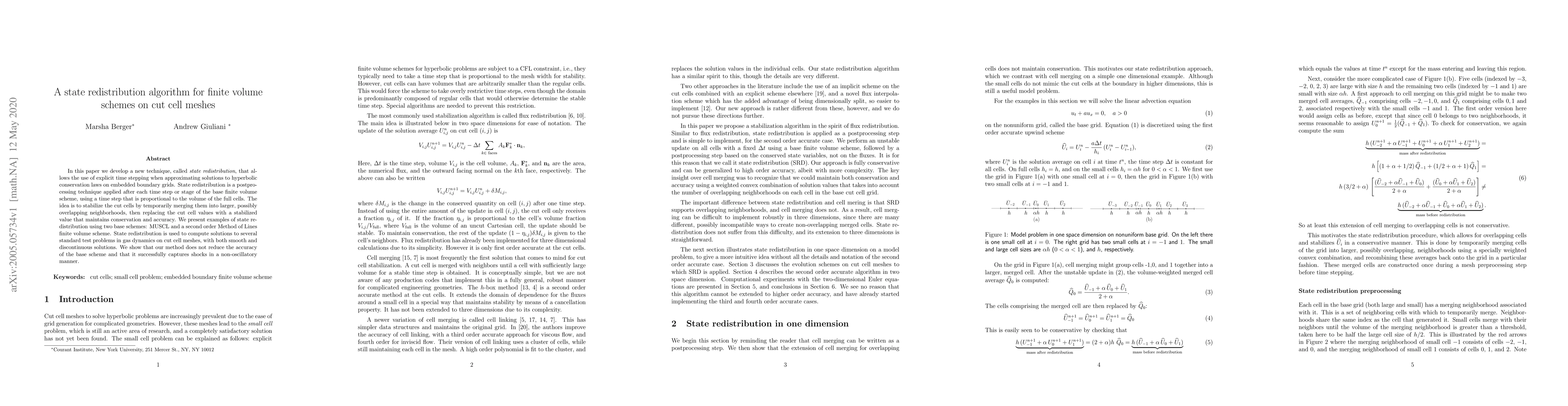 This paper introduces a state redistribution technique to stabilize explicit time-stepping for hyperbolic conservation laws on cut cell meshes. It merges cut cells into larger neighborhoods to maintain conservation and accuracy, tested on MUSCL and a second-order Method of Lines, showing no loss of base scheme accuracy and effective shock capturing.