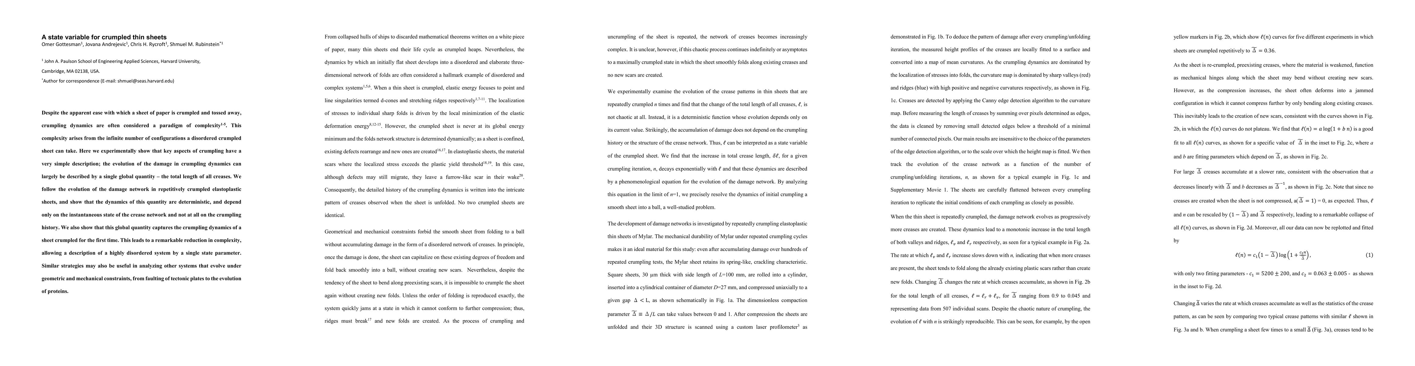 This paper demonstrates that the complexity of crumpling thin sheets can be simplified by focusing on the total length of creases, a single global quantity that deterministically describes the evolution of damage. This approach reduces the complexity of disordered crumpled sheets to a manageable state variable, potentially applicable to other constrained systems.