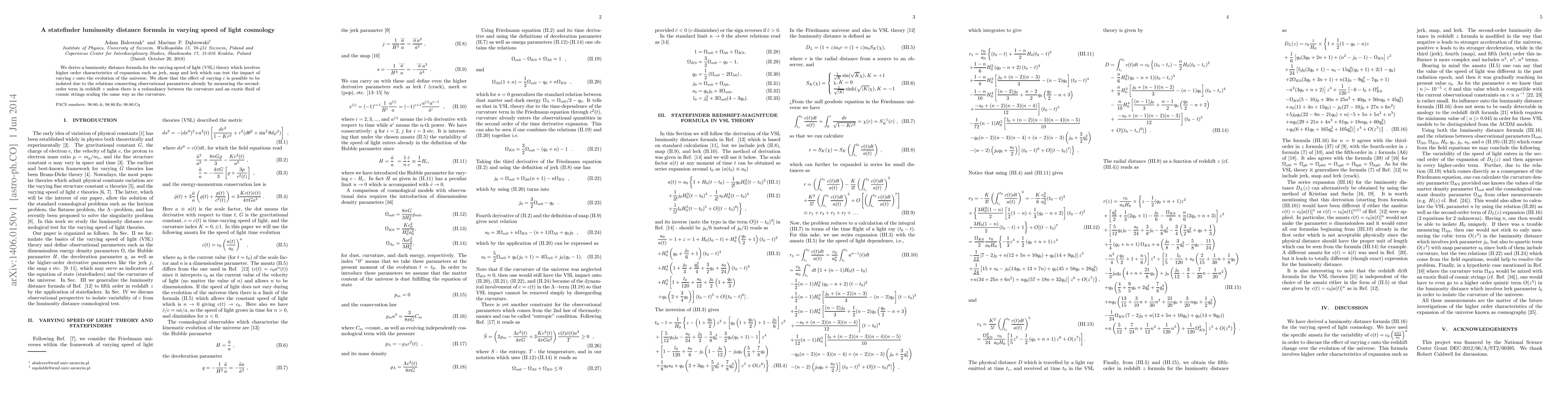 We derive a luminosity distance formula for the varying speed of light (VSL) theory which involves higher order characteristics of expansion such as jerk, snap and lerk which can test the impact of varying $c$ onto the evolution of the universe. We show that the effect of varying $c$ is possible to be isolated due to the relations connecting observational parameters already by measuring the second-order term in redshift $z$ unless there is a redundancy between the curvature and an exotic fluid of cosmic strings scaling the same way as the curvature.