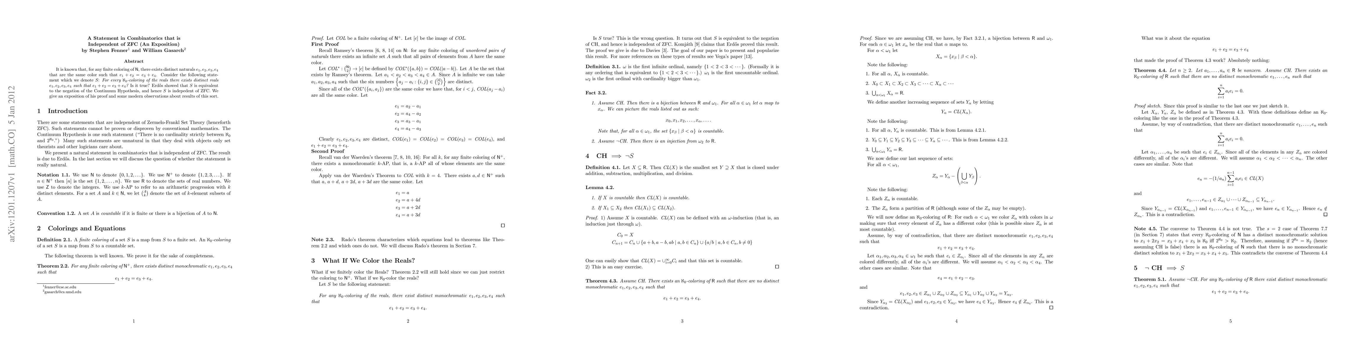 It is known that, for any finite coloring of the naturals, there exists distinct naturals $e_1,e_2,e_3,e_4$ that are the same color such that $e_1+e_2=e_3+e_4$. Consider the following statement which we denote S: For every $\aleph_0$-coloring of the reals there exists distinct reals $e_1,e_2,e_3,e_4$ such that $e_1+e_2=e_3+e_4$?} Is it true? Erdos showed that S is equivalent to the negation of the Continuum Hypothesis, and hence S is indepedent of ZFC. We give an exposition of his proof and some modern observations about results of this sort.