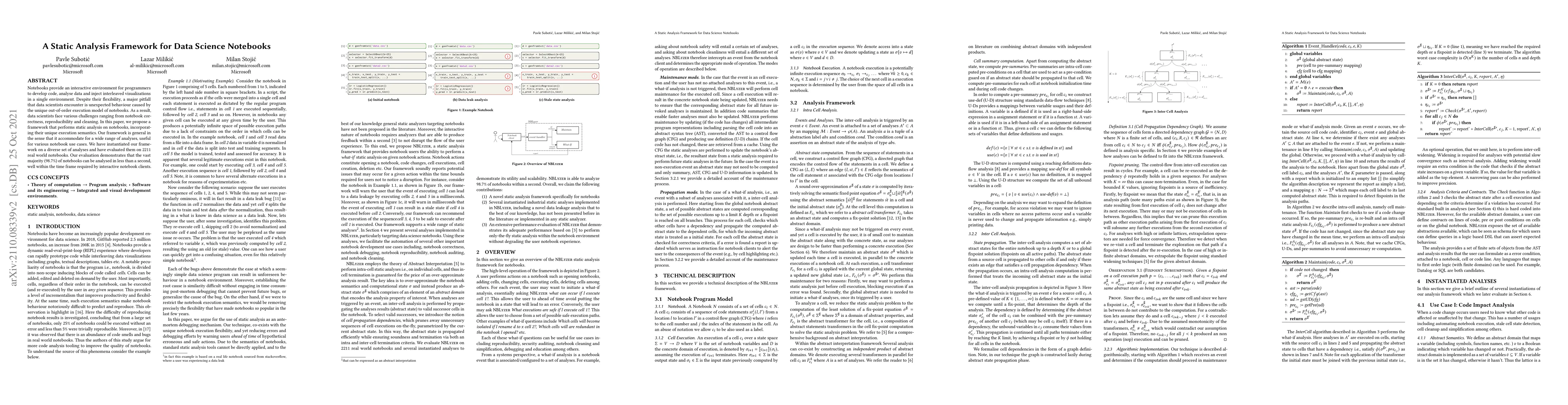 This paper proposes a static analysis framework for data science notebooks to address issues like unexpected behavior, correctness, and reproducibility. The framework accommodates various analyses and was evaluated on 2211 notebooks, showing that 98.7% can be analyzed in under a second.