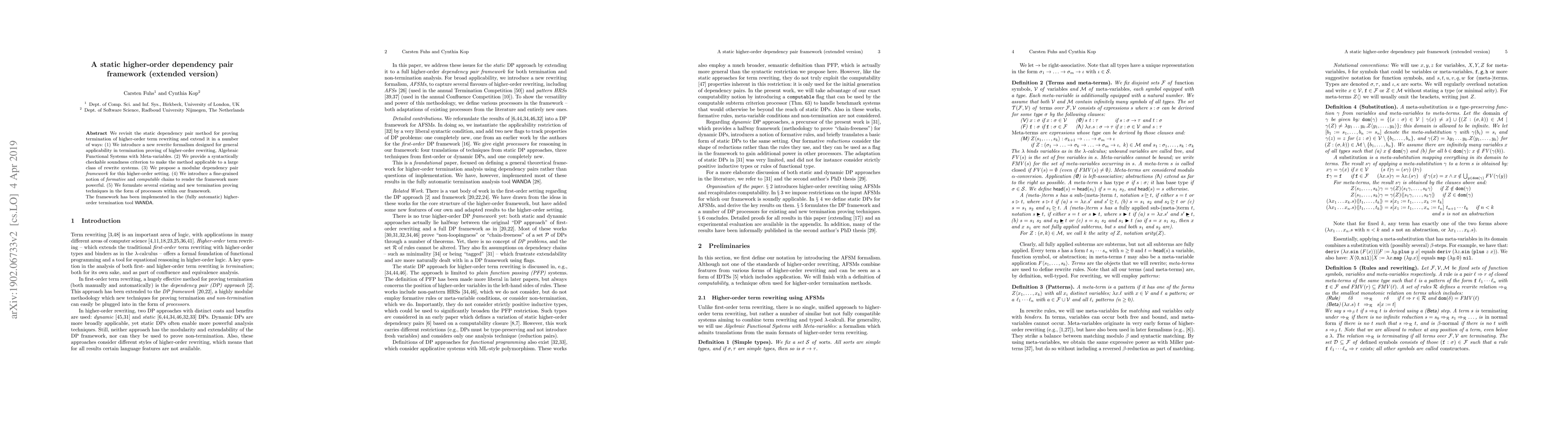 Researchers extend a static dependency pair method to prove termination of higher-order term rewriting systems, introducing new formalisms and techniques that improve the framework's applicability and power.