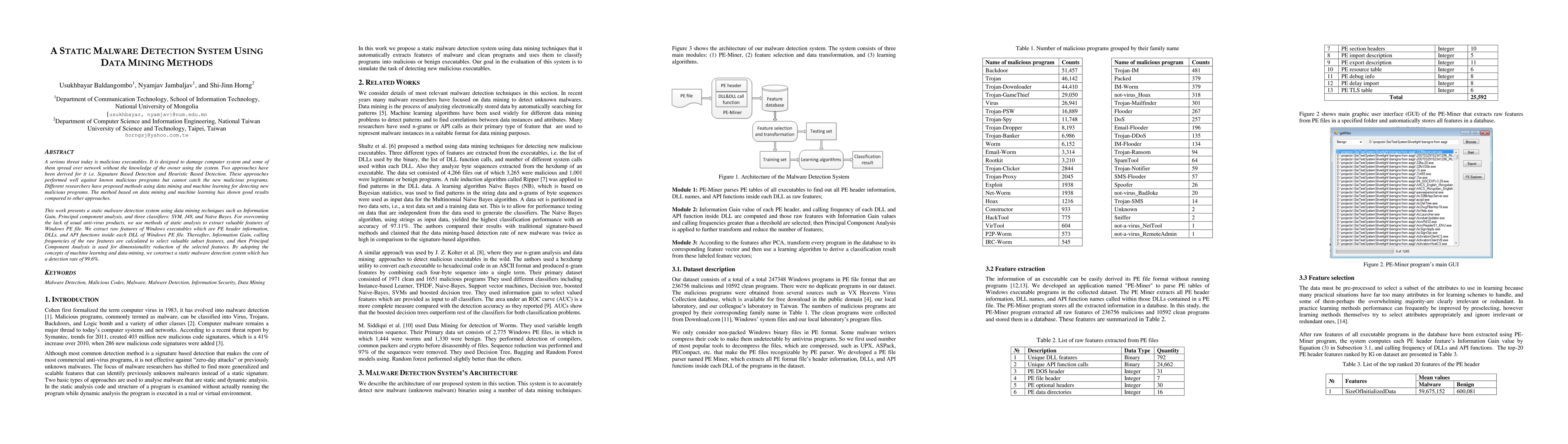 This paper proposes a static malware detection system leveraging data mining methods, including Information Gain and Principal Component Analysis, along with classifiers like SVM, J48, and Naive Bayes, to identify new malicious executables. The system extracts features from Windows PE files and achieves a high detection rate of 99.6%.