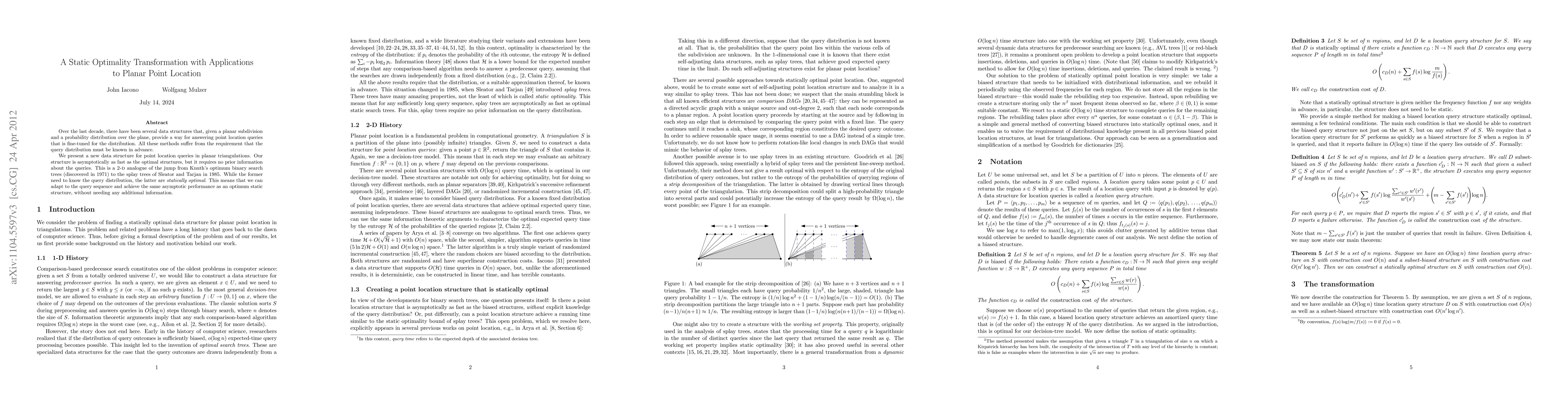 Over the last decade, there have been several data structures that, given a planar subdivision and a probability distribution over the plane, provide a way for answering point location queries that is fine-tuned for the distribution. All these methods suffer from the requirement that the query distribution must be known in advance. We present a new data structure for point location queries in planar triangulations. Our structure is asymptotically as fast as the optimal structures, but it requires no prior information about the queries. This is a 2D analogue of the jump from Knuth's optimum binary search trees (discovered in 1971) to the splay trees of Sleator and Tarjan in 1985. While the former need to know the query distribution, the latter are statically optimal. This means that we can adapt to the query sequence and achieve the same asymptotic performance as an optimum static structure, without needing any additional information.