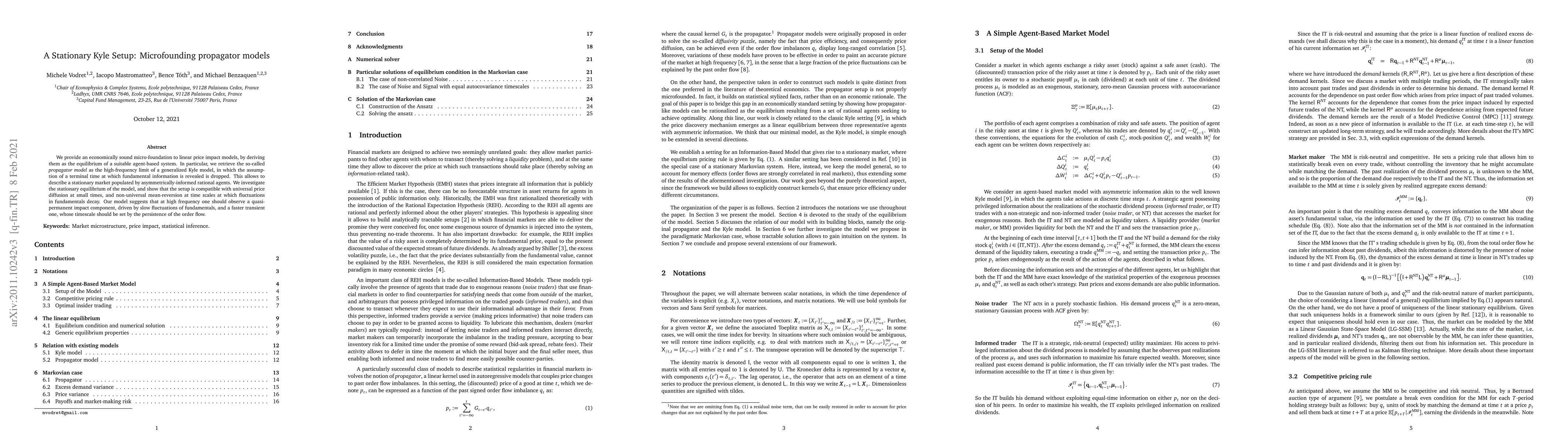 We provide an economically sound micro-foundation to linear price impact models, by deriving them as the equilibrium of a suitable agent-based system. Our setup generalizes the well-known Kyle model, by dropping the assumption of a terminal time at which fundamental information is revealed so to describe a stationary market, while retaining agents' rationality and asymmetric information. We investigate the stationary equilibrium for arbitrary Gaussian noise trades and fundamental information, and show that the setup is compatible with universal price diffusion at small times, and non-universal mean-reversion at time scales at which fluctuations in fundamentals decay. Our model provides a testable relation between volatility of prices, magnitude of fluctuations in fundamentals and level of volume traded in the market.