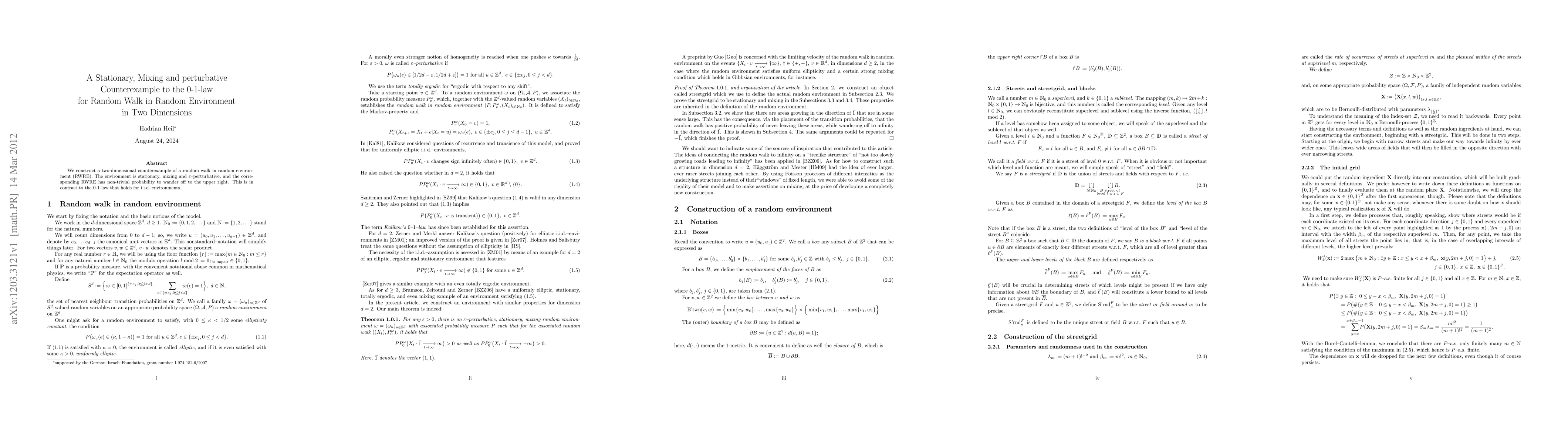 Researchers create a 2D counterexample to the 0-1-law for random walks in random environments, showing that stationary, mixing, and perturbative environments can lead to non-trivial probability of wandering off in certain directions.