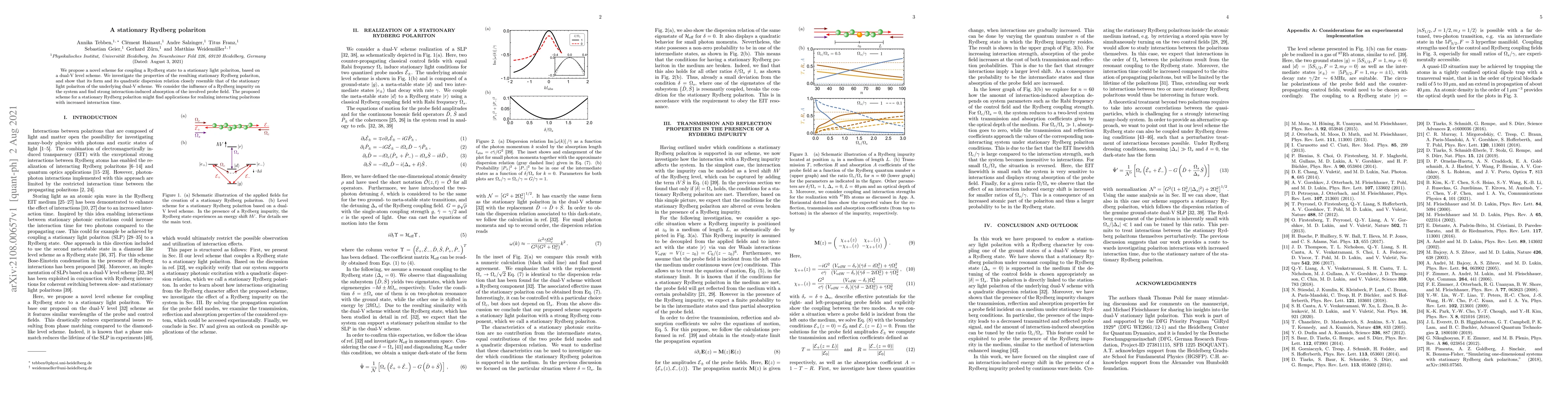 The proposed scheme supports a stationary Rydberg polariton with a quadratic dispersion relation, directly linked to the stationary light polariton of the underlying dual-V scheme.
