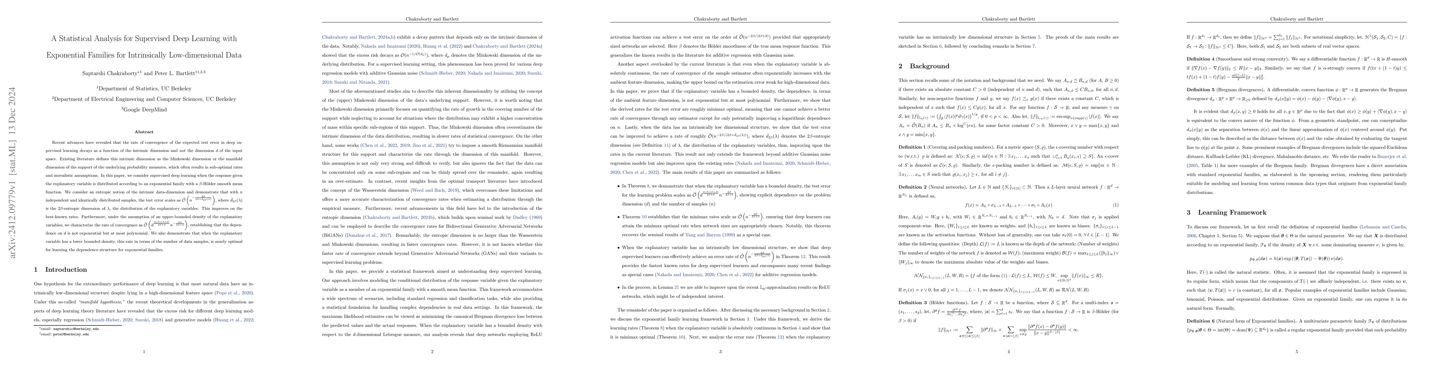 This paper presents a statistical analysis for supervised deep learning, focusing on intrinsically low-dimensional data modeled through exponential families. It demonstrates improved convergence rates for test error based on entropic intrinsic dimensions, achieving polynomial rather than exponential dependence on input space dimensionality, and showing near-optimal rates under bounded explanatory variable densities.
