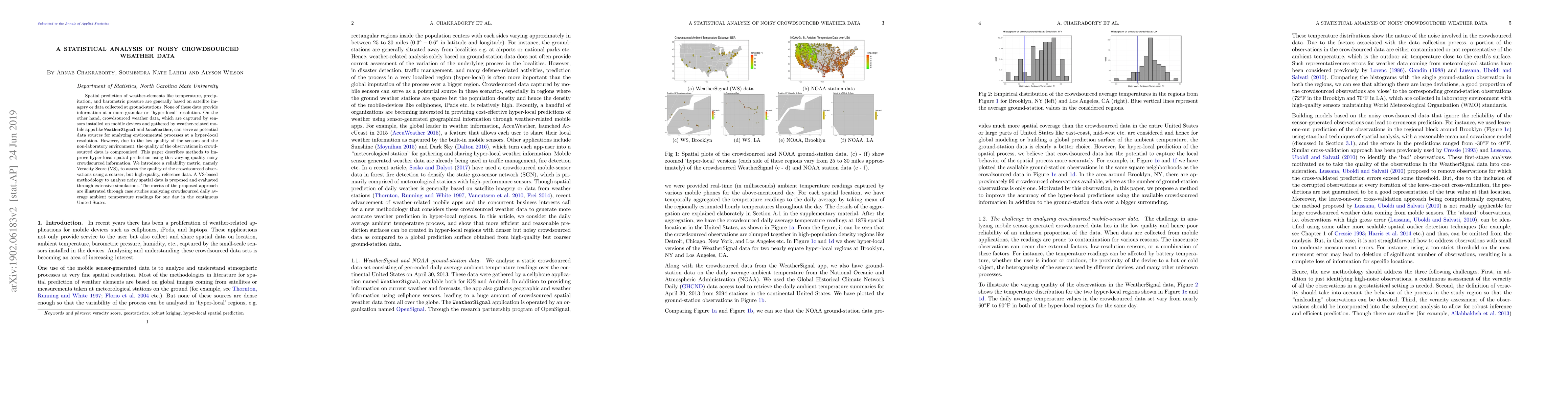 This paper proposes methods to enhance hyper-local weather predictions using noisy crowdsourced data from mobile devices. It introduces a Veracity Score (VS) to assess data quality and presents a VS-based methodology to improve spatial predictions, demonstrated through simulations and case studies on daily temperature readings in the U.S.