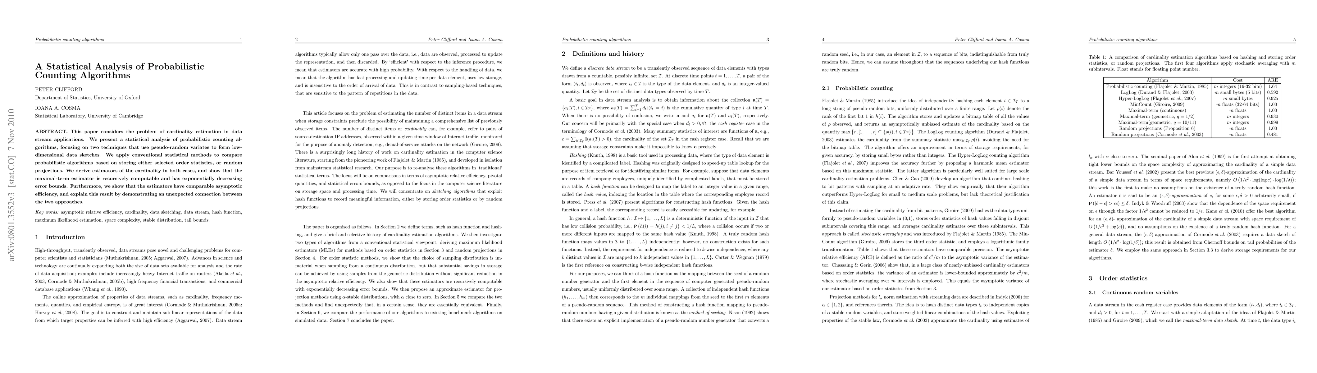 This paper statistically analyzes probabilistic counting algorithms used in data stream applications, comparing two techniques with pseudo-random variates to estimate cardinality with comparable asymptotic efficiency and exponentially decreasing error bounds.