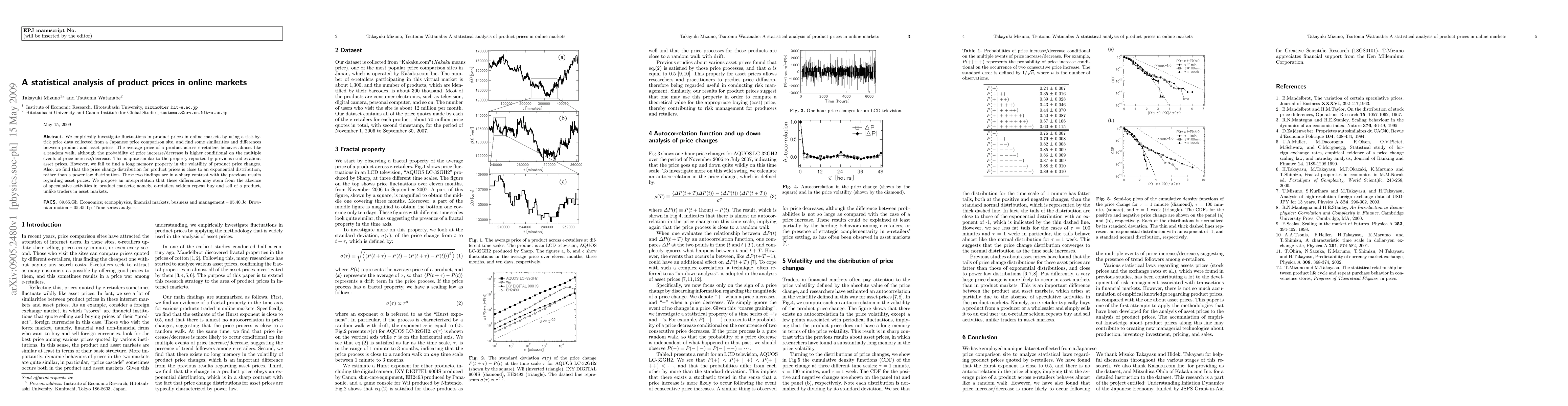 We empirically investigate fluctuations in product prices in online markets by using a tick-by-tick price data collected from a Japanese price comparison site, and find some similarities and differences between product and asset prices. The average price of a product across e-retailers behaves almost like a random walk, although the probability of price increase/decrease is higher conditional on the multiple events of price increase/decrease. This is quite similar to the property reported by previous studies about asset prices. However, we fail to find a long memory property in the volatility of product price changes. Also, we find that the price change distribution for product prices is close to an exponential distribution, rather than a power law distribution. These two findings are in a sharp contrast with the previous results regarding asset prices. We propose an interpretation that these differences may stem from the absence of speculative activities in product markets; namely, e-retailers seldom repeat buy and sell of a product, unlike traders in asset markets.