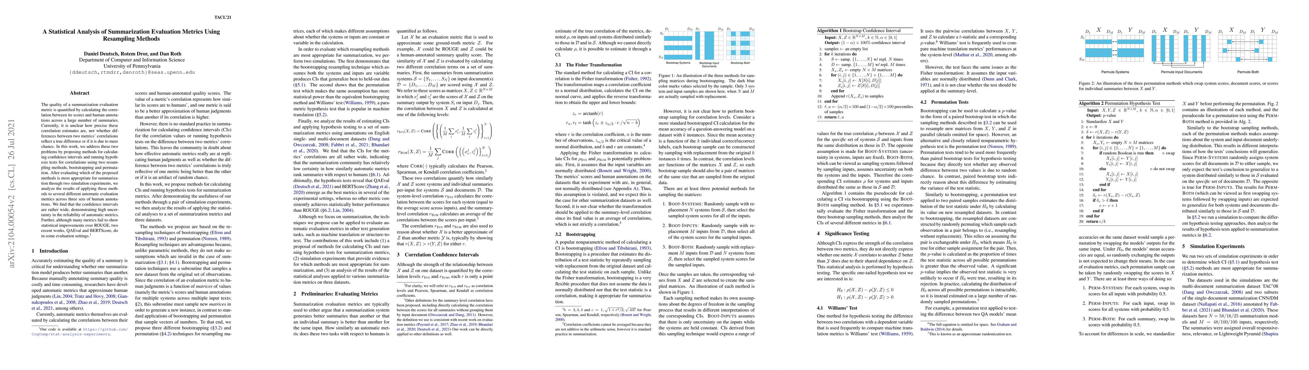This paper proposes resampling methods to calculate confidence intervals and conduct hypothesis tests for summarization evaluation metrics, revealing high uncertainty in their reliability. The study finds that while some metrics, like ROUGE, remain dominant, QAEval and BERTScore show statistical improvements in certain contexts.