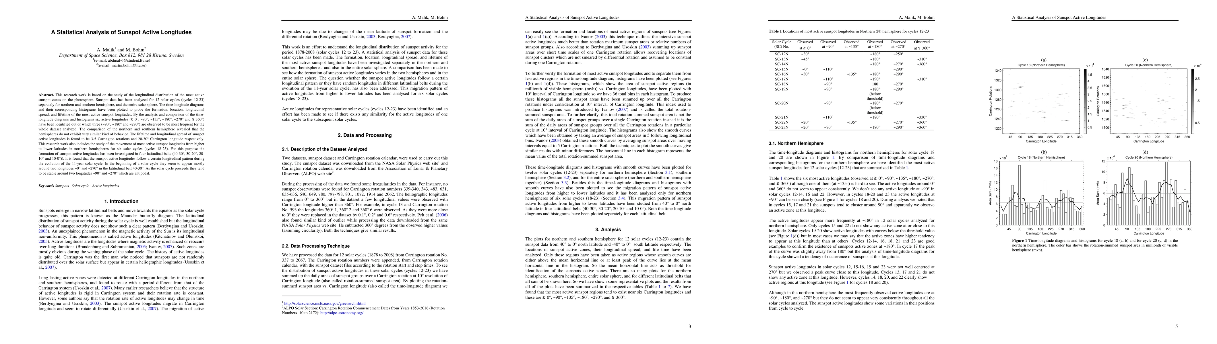 This research work is based on the study of the longitudinal distribution of the most active sunspot zones on the photosphere. Sunspot data has been analyzed for 12 solar cycles (cycles 12-23) separately for northern and southern hemisphere, and the entire solar sphere. The timelongitude diagrams and their corresponding histograms have been plotted to probe the formation, location, longitudinal spread, and lifetime of the most active sunspot longitudes. By the analysis and comparison of the time- longitude diagrams and histograms six active longitudes (>0, ~90, ~135, ~180, ~270 and <360 degrees) have been identified out of which three (~90, ~180 and ~270 degrees) are observed to be most frequent for the whole dataset analyzed. The comparison of the northern and southern hemisphere revealed that the hemispheres do not exhibit very similar kind of behavior. The lifetime and longitudinal spread of sunspot active longitudes is found to be 3-5 Carrington rotations and 20-30 degrees Carrington longitude respectively. This research work also includes the study of the movement of most active sunspot longitudes from higher to lower latitudes in northern hemispheres for six solar cycles (cycles 18-23). For this purpose the formation of sunspot active longitudes has been investigated in four latitudinal belts (40-30, 30-20, 20-10 and 10-0 degrees)). It is found that the sunspot active longitudes follow a certain longitudinal pattern during the evolution of the 11-year solar cycle. In the beginning of a solar cycle they seem to appear mostly around two longitudes ~0 degree and ~270 degrees in the latitudinal belt 40-30 degrees. As the solar cycle proceeds they tend to be stable around two longitudes ~90 degrees and ~270 degrees which are antipodal.