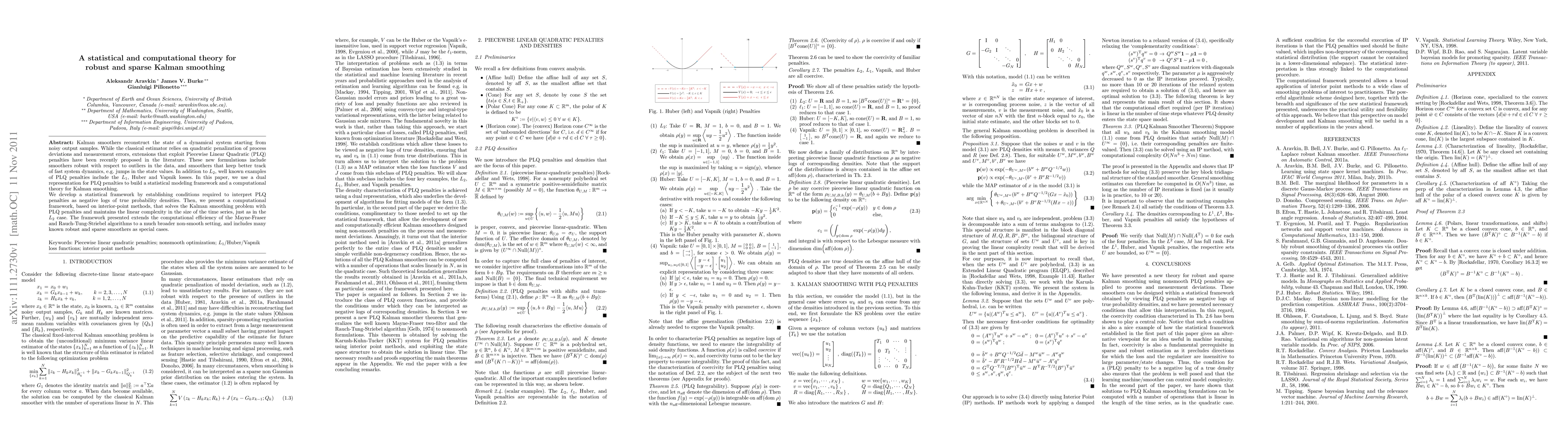 This paper develops a statistical and computational framework for robust and sparse Kalman smoothing using Piecewise Linear Quadratic (PLQ) penalties, including L1, Huber, and Vapnik losses. It establishes conditions for PLQ penalties as negative logs of probability densities and presents an efficient computational method based on interior-point methods.