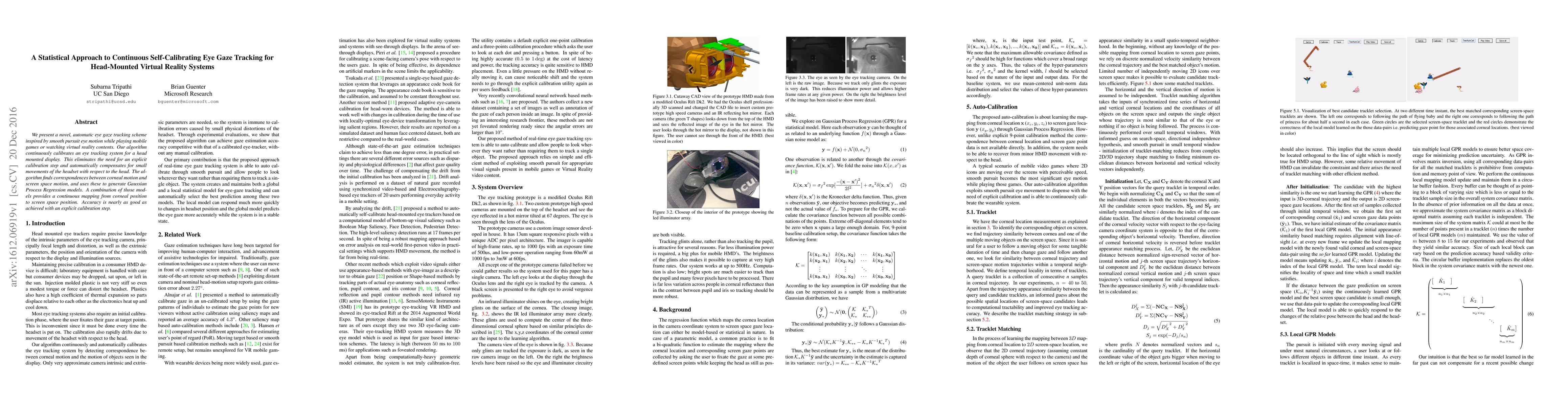 This paper introduces a continuous self-calibrating eye gaze tracking algorithm for head-mounted VR systems, eliminating the need for explicit calibration. It uses Gaussian Process Regression models based on corneal and screen space motion correspondences to maintain accurate tracking.