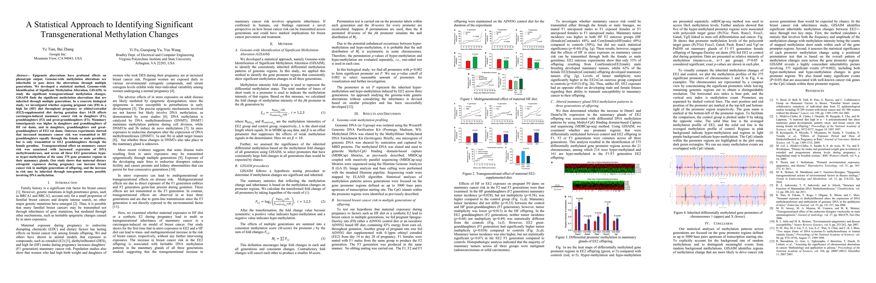 This research develops GISAIM, a statistical method to identify significant transgenerational methylation changes, and applies it to study the effects of high-fat and estrogenic diet exposures in pregnant rats. It finds that these exposures can increase mammary cancer risk in multiple generations, potentially through inherited DNA methylation changes.