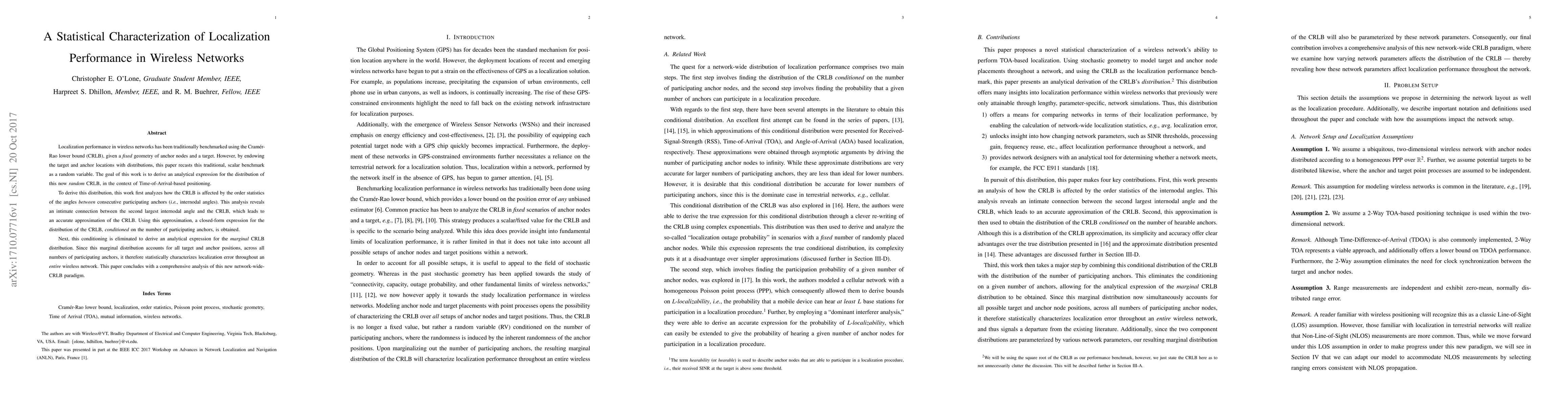 Localization performance in wireless networks has been traditionally benchmarked using the Cramer-Rao lower bound (CRLB), given a fixed geometry of anchor nodes and a target. However, by endowing the target and anchor locations with distributions, this paper recasts this traditional, scalar benchmark as a random variable. The goal of this work is to derive an analytical expression for the distribution of this now random CRLB, in the context of Time-of-Arrival-based positioning. To derive this distribution, this work first analyzes how the CRLB is affected by the order statistics of the angles between consecutive participating anchors (i.e., internodal angles). This analysis reveals an intimate connection between the second largest internodal angle and the CRLB, which leads to an accurate approximation of the CRLB. Using this approximation, a closed-form expression for the distribution of the CRLB, conditioned on the number of participating anchors, is obtained. Next, this conditioning is eliminated to derive an analytical expression for the marginal CRLB distribution. Since this marginal distribution accounts for all target and anchor positions, across all numbers of participating anchors, it therefore statistically characterizes localization error throughout an entire wireless network. This paper concludes with a comprehensive analysis of this new network-wide-CRLB paradigm.