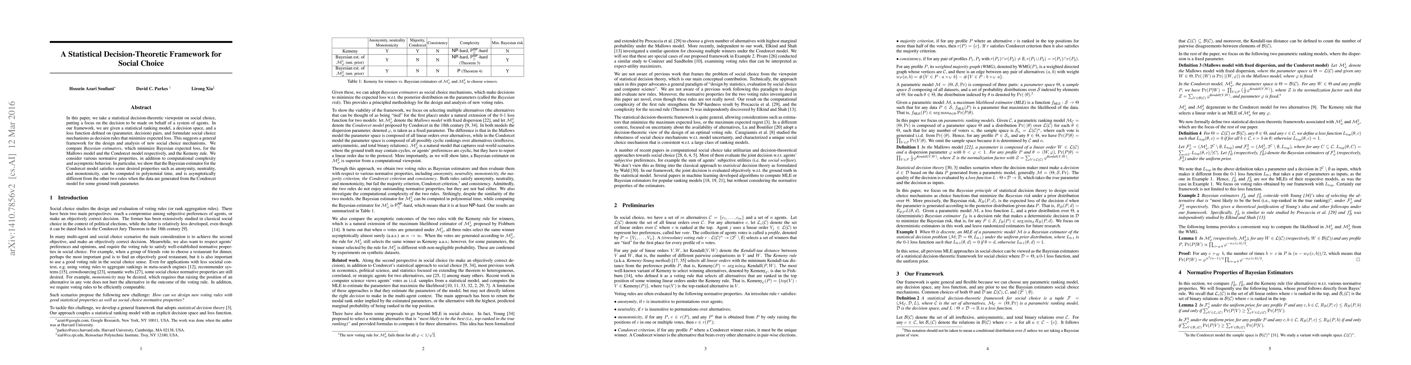 This paper proposes a statistical decision-theoretic framework for social choice, focusing on mechanisms that minimize expected loss. It compares Bayesian estimators for the Mallows and Condorcet models, and the Kemeny rule, highlighting the Condorcet model's Bayesian estimator's desirable properties, polynomial time computation, and asymptotic differences.