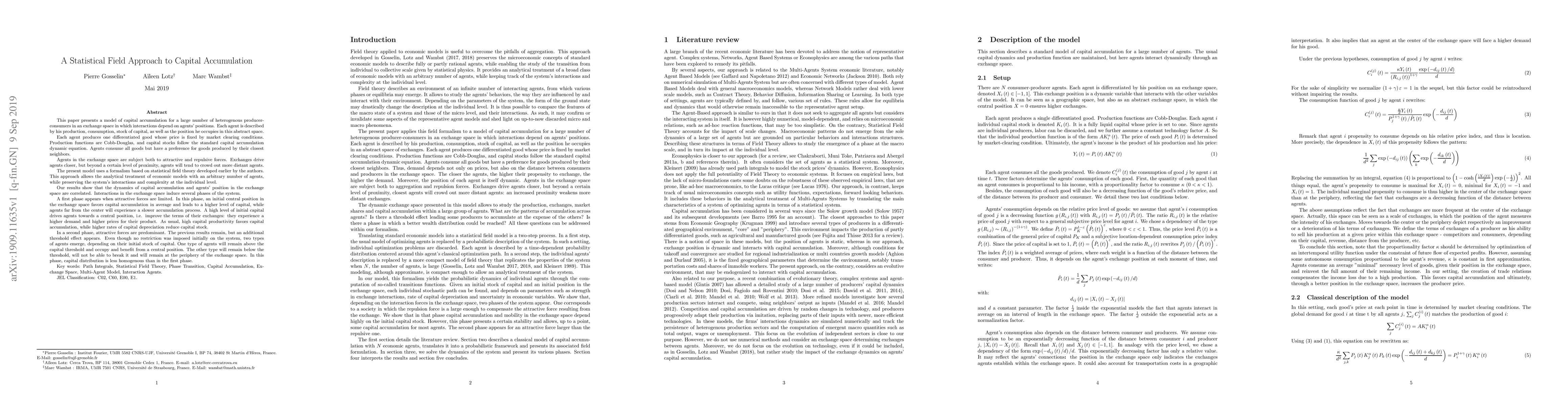 This paper presents a model of capital accumulation for a large number of heterogenous producer-consumers in an exchange space in which interactions depend on agents' positions. Each agent is described by his production, consumption, stock of capital, as well as the position he occupies in this abstract space. Each agent produces one differentiated good whose price is fixed by market clearing conditions. Production functions are Cobb-Douglas, and capital stocks follow the standard capital accumulation dynamic equation. Agents consume all goods but have a preference for goods produced by their closest neighbors. Agents in the exchange space are subject both to attractive and repulsive forces. Exchanges drive agents closer, but beyond a certain level of proximity, agents will tend to crowd out more distant agents. The present model uses a formalism based on statistical field theory developed earlier by the authors. This approach allows the analytical treatment of economic models with an arbitrary number of agents, while preserving the system's interactions and complexity at the individual level. Our results show that the dynamics of capital accumulation and agents' position in the exchange space are correlated. Interactions in the exchange space induce several phases of the system. A first phase appears when attractive forces are limited. In this phase, an initial central position in the exchange space favors capital accumulation in average and leads to a higher level of capital, while agents far from the center will experience a slower accumulation process. A high level of initial capital drives agents towards a central position, i.e. improve the terms of their exchanges: they experience a higher demand and higher prices for their product. As usual, high capital productivity favors capital accumulation, while higher rates of capital depreciation reduce capital stock. In a second phase, attractive forces are predominant. The previous results remain, but an additional threshold effect appears. Even though no restriction was imposed initially on the system, two types of agents emerge, depending on their initial stock of capital. One type of agents will remain above the capital threshold and occupy and benefit from a central position. The other type will remain below the threshold, will not be able to break it and will remain at the periphery of the exchange space. In this phase, capital distribution is less homogenous than in the first phase.