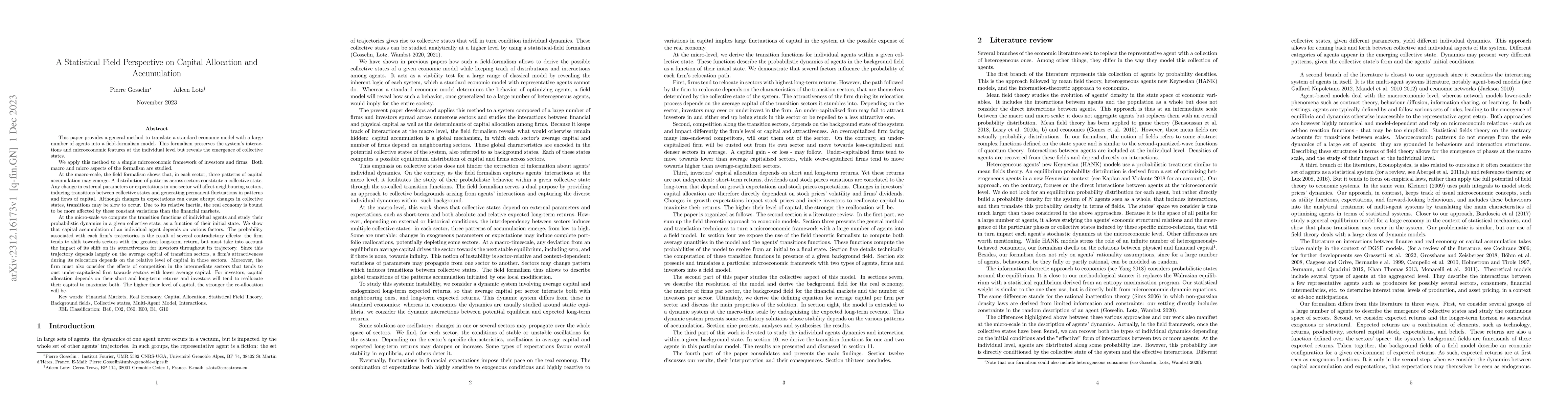 This paper provides a general method to translate a standard economic model with a large number of agents into a field-formalism model. This formalism preserves the system's interactions and microeconomic features at the individual level but reveals the emergence of collective states.We apply this method to a simple microeconomic framework of investors and firms. Both macro and micro aspects of the formalism are studied.At the macro-scale, the field formalism shows that, in each sector, three patterns of capital accumulation may emerge. A distribution of patterns across sectors constitute a collective state. Any change in external parameters or expectations in one sector will affect neighbouring sectors, inducing transitions between collective states and generating permanent fluctuations in patterns and flows of capital. Although changes in expectations can cause abrupt changes in collective states, transitions may be slow to occur. Due to its relative inertia, the real economy is bound to be more affected by these constant variations than the financial markets.At the micro-scale we compute the transition functions of individual agents and study their probabilistic dynamics in a given collective state, as a function of their initial state. We show that capital accumulation of an individual agent depends on various factors. The probability associated with each firm's trajectories is the result of several contradictory effects: the firm tends to shift towards sectors with the greatest long-term return, but must take into account the impact of its shift on its attractiveness for investors throughout its trajectory. Since this trajectory depends largely on the average capital of transition sectors, a firm's attractiveness during its relocation depends on the relative level of capital in those sectors. Moreover, the firm must also consider the effects of competition in the intermediate sectors that tends to oust under-capitalized firm towards sectors with lower average capital. For investors, capital allocation depends on their short and long-term returns and investors will tend to reallocate their capital to maximize both. The higher their level of capital, the stronger the re-allocation will be.