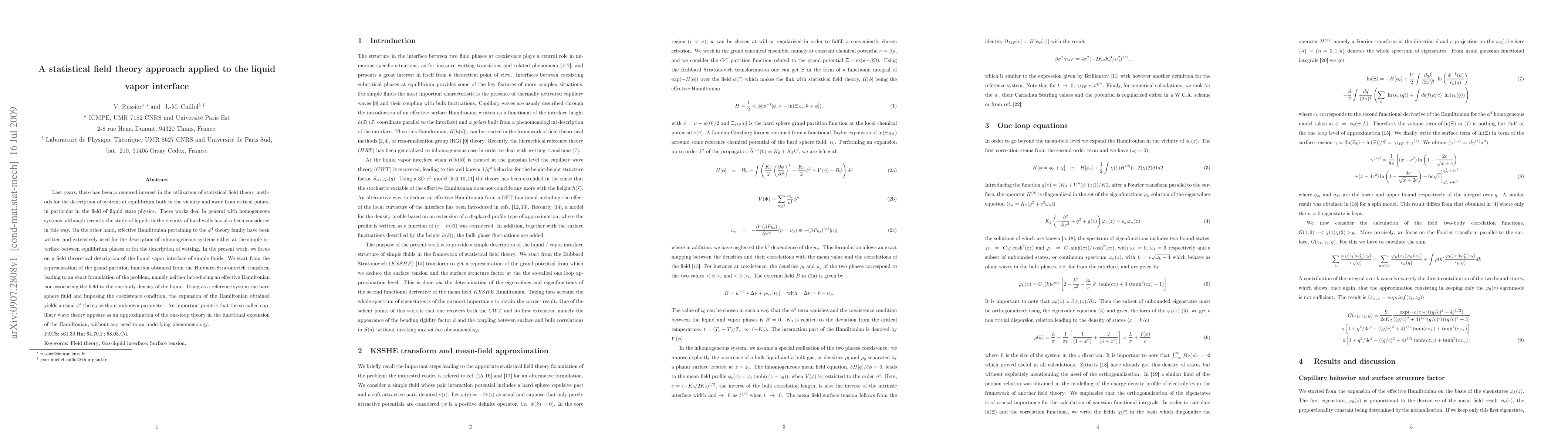 This paper employs statistical field theory to describe the liquid vapor interface, focusing on a precise formulation derived from the Hubbard-Stratonovich transform, and showing that capillary wave theory emerges naturally as an approximation within the theory. The study avoids effective Hamiltonians and parameter assumptions, using hard sphere fluid as a reference.