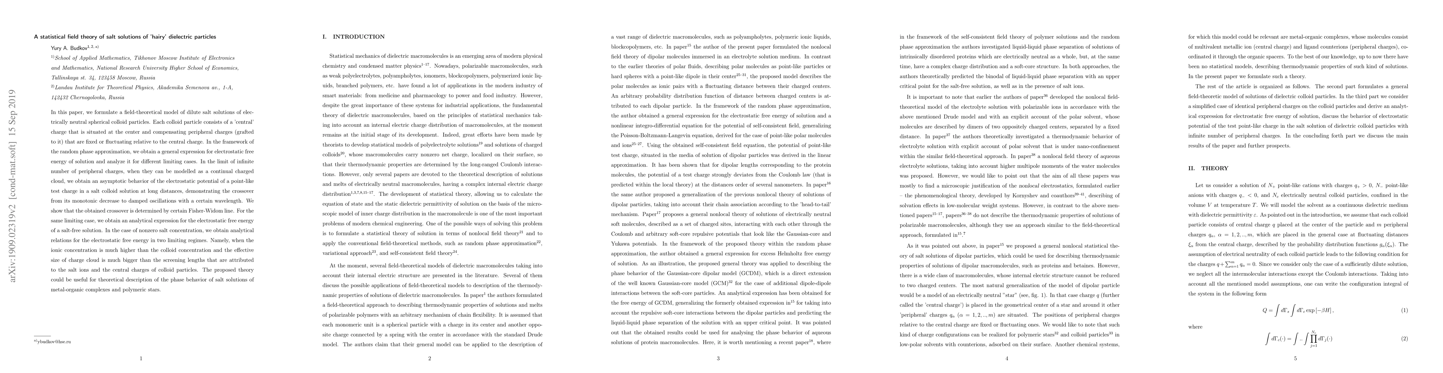 In this paper, we formulate a field-theoretical model of dilute salt solutions of electrically neutral spherical colloid particles. Each colloid particle consists of a 'central' charge that is situated at the center and compensating peripheral charges (grafted to it) that are fixed or fluctuating relative to the central charge. In the framework of the random phase approximation, we obtain a general expression for electrostatic free energy of solution and analyze it for different limiting cases. In the limit of infinite number of peripheral charges, when they can be modelled as a continual charged cloud, we obtain an asymptotic behavior of the electrostatic potential of a point-like test charge in a salt colloid solution at long distances, demonstrating the crossover from its monotonic decrease to damped oscillations with a certain wavelength. We show that the obtained crossover is determined by certain Fisher-Widom line. For the same limiting case, we obtain an analytical expression for the electrostatic free energy of a salt-free solution. In the case of nonzero salt concentration, we obtain analytical relations for the electrostatic free energy in two limiting regimes. Namely, when the ionic concentration is much higher than the colloid concentration and the effective size of charge cloud is much bigger than the screening lengths that are attributed to the salt ions and the central charges of colloid particles. The proposed theory could be useful for theoretical description of the phase behavior of salt solutions of metal-organic complexes and polymeric stars.
