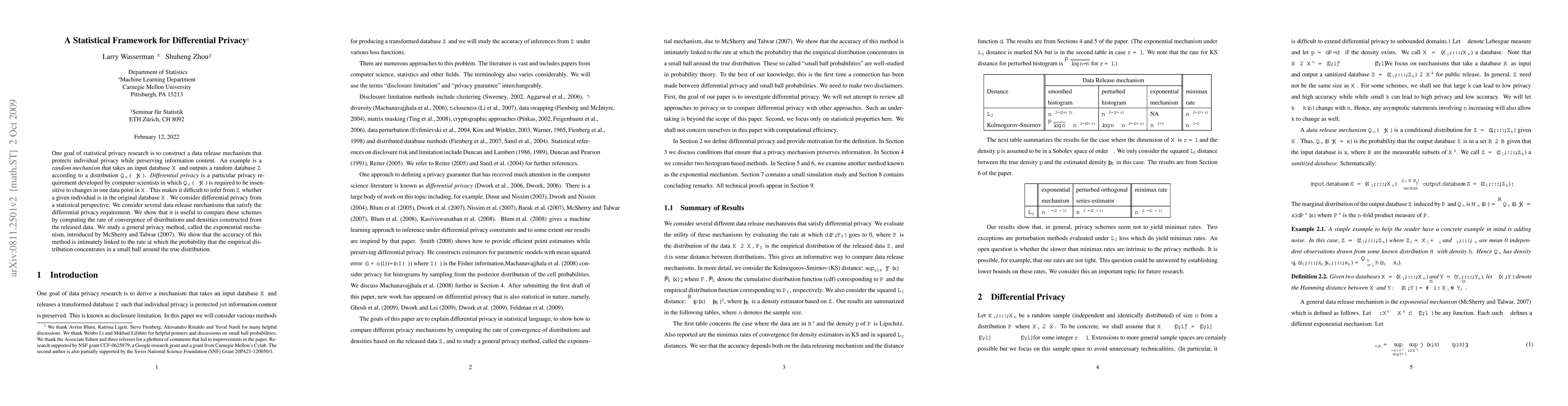 This paper develops a statistical framework for differential privacy, focusing on mechanisms that protect individual privacy while maintaining data utility. It examines various data release methods, particularly the exponential mechanism, and analyzes their accuracy in relation to the rate of convergence of empirical distributions.