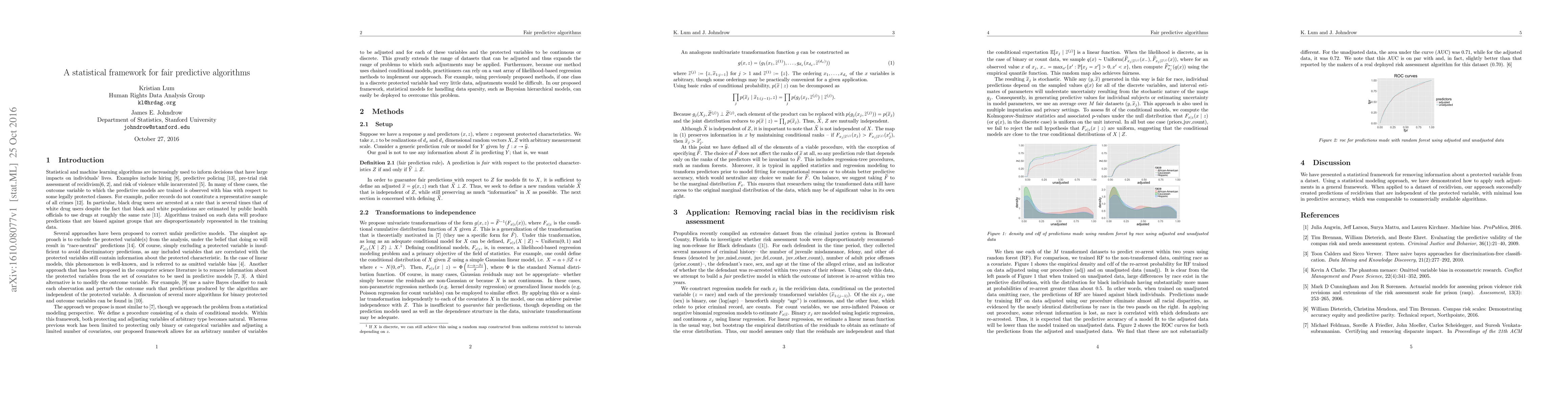 This paper introduces a statistical framework to eliminate bias in predictive algorithms, defining bias probabilistically. It demonstrates that simply omitting protected variables like race from models can still lead to disparate outcomes. The proposed method removes all protected variable information from training data, effectively reducing racial disparities in predictions about recidivism, without significantly affecting accuracy.