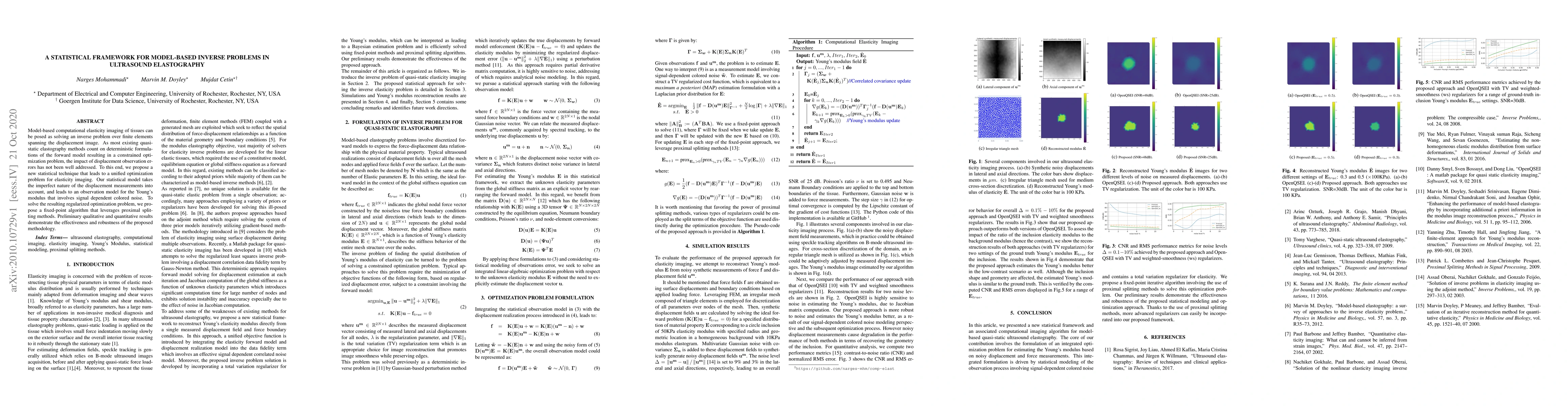 Model-based computational elasticity imaging of tissues can be posed as solving an inverse problem over finite elements spanning the displacement image. As most existing quasi-static elastography methods count on deterministic formulations of the forward model resulting in a constrained optimization problem, the impact of displacement observation errors has not been well addressed. To this end, we propose a new statistical technique that leads to a unified optimization problem for elasticity imaging. Our statistical model takes the imperfect nature of the displacement measurements into account, and leads to an observation model for the Young's modulus that involves signal dependent colored noise. To solve the resulting regularized optimization problem, we propose a fixed-point algorithm that leverages proximal splitting methods. Preliminary qualitative and quantitative results demonstrate the effectiveness and robustness of the proposed methodology.