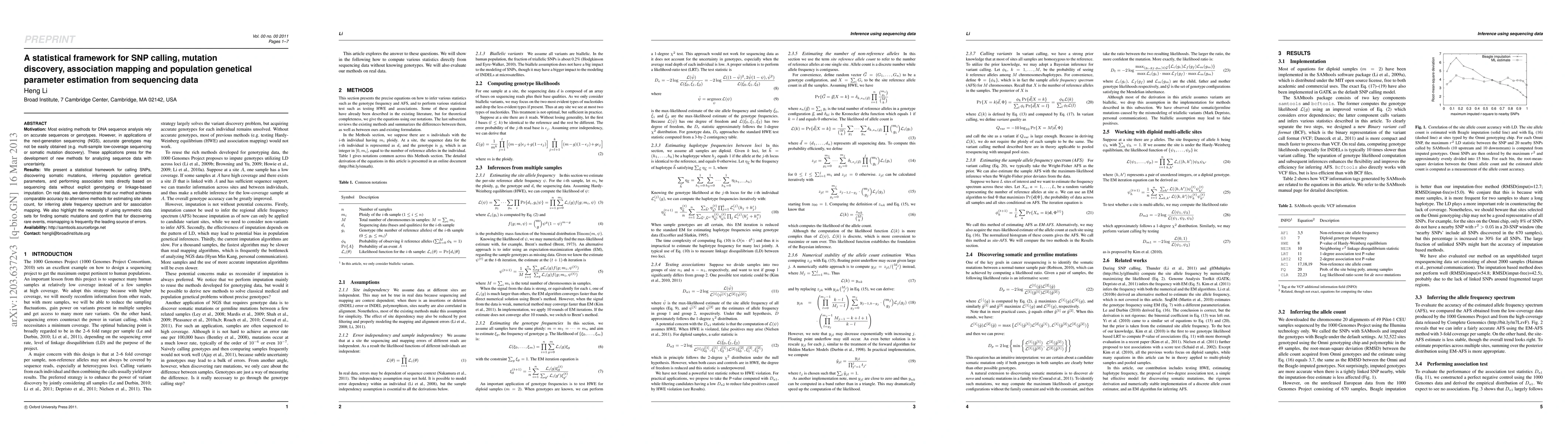 Motivation: Most existing methods for DNA sequence analysis rely on accurate sequences or genotypes. However, in applications of the next-generation sequencing (NGS), accurate genotypes may not be easily obtained (e.g. multi-sample low-coverage sequencing or somatic mutation discovery). These applications press for the development of new methods for analyzing sequence data with uncertainty. Results: We present a statistical framework for calling SNPs, discovering somatic mutations, inferring population genetical parameters and performing association tests directly based on sequencing data without explicit genotyping or linkage-based imputation. On real data, we demonstrate that our method achieves comparable accuracy to alternative methods for estimating site allele count, for inferring allele frequency spectrum and for association mapping. We also highlight the necessity of using symmetric datasets for finding somatic mutations and confirm that for discovering rare events, mismapping is frequently the leading source of errors. Availability: http://samtools.sourceforge.net. Contact: [email protected].